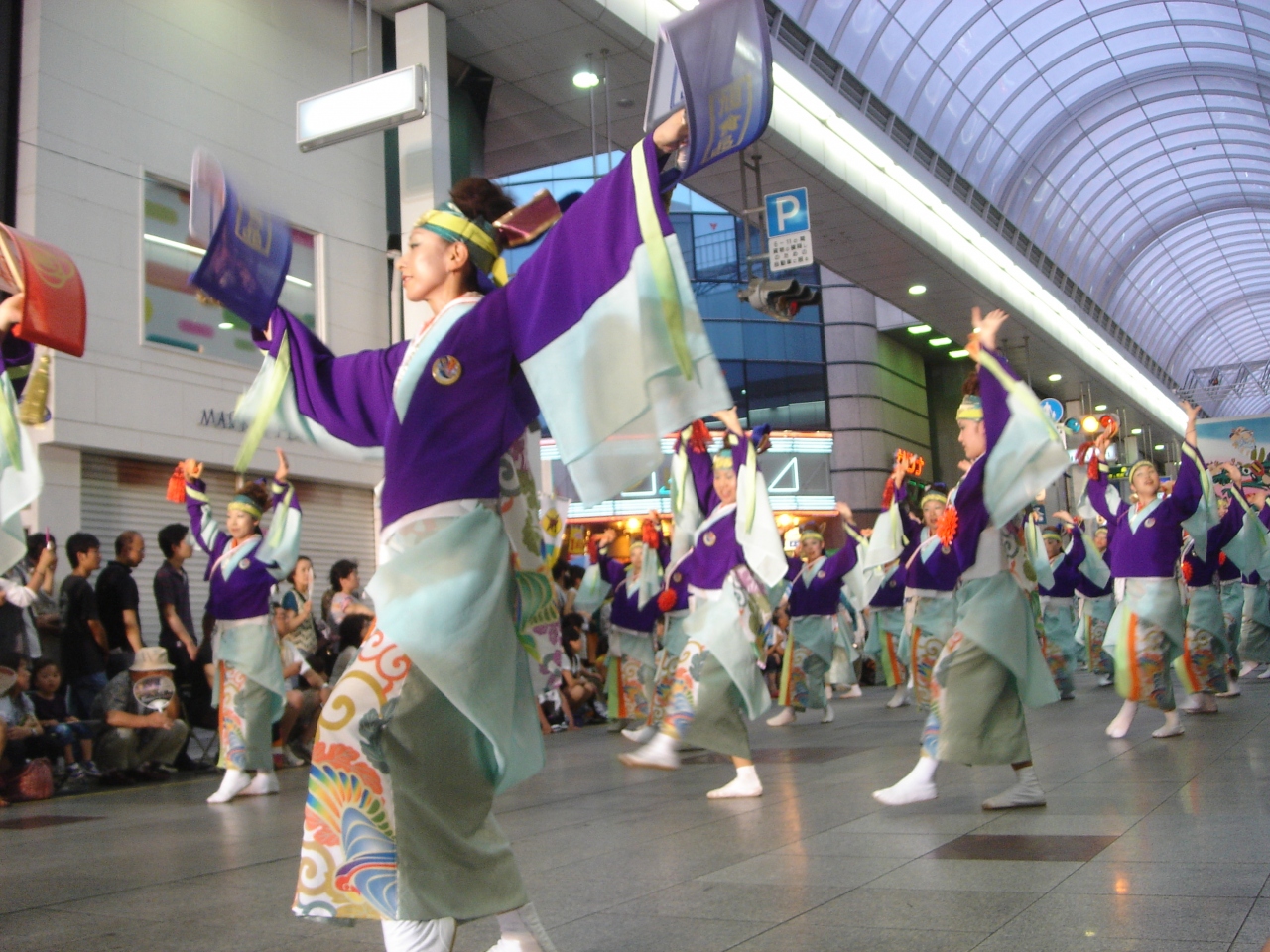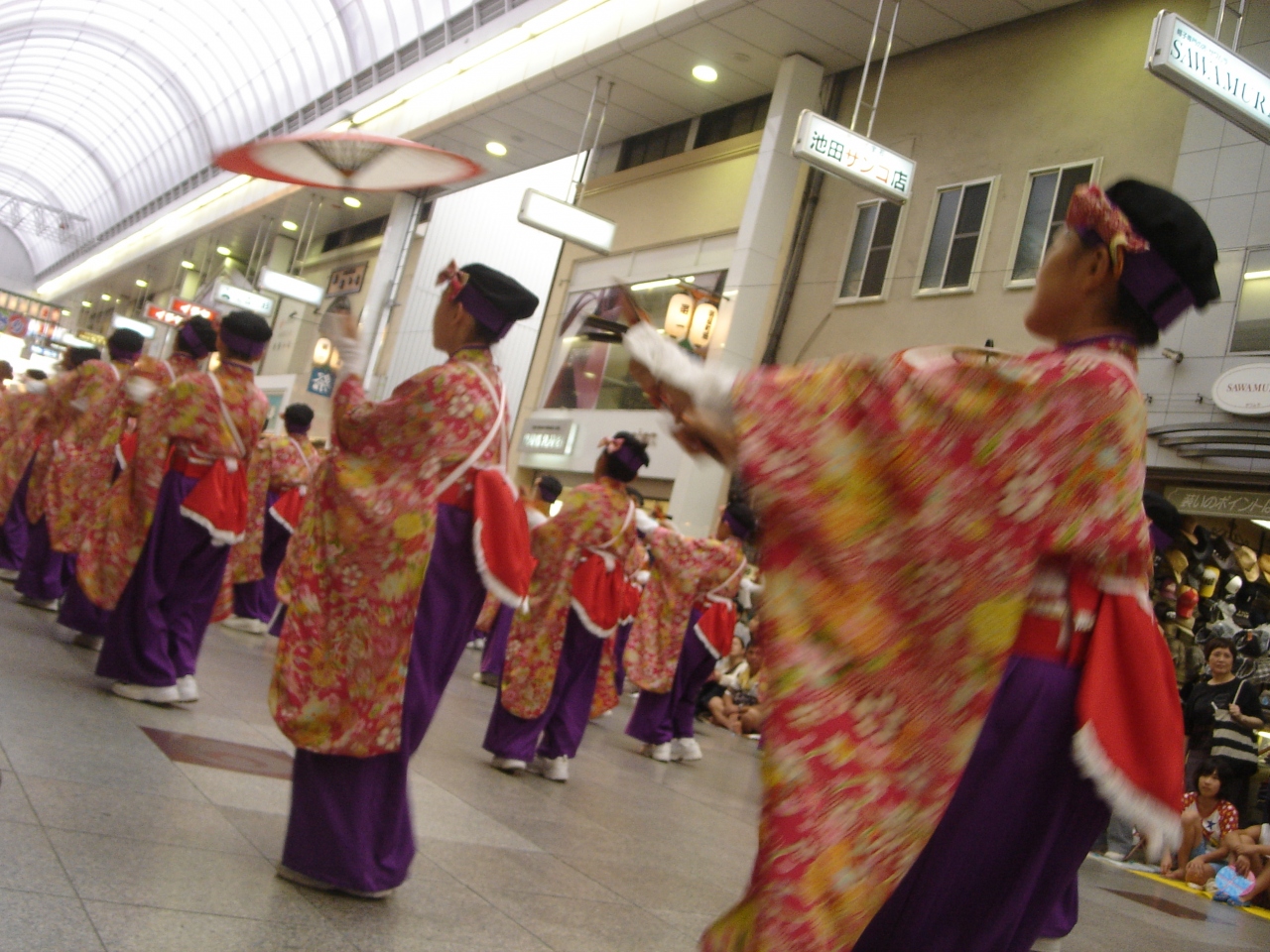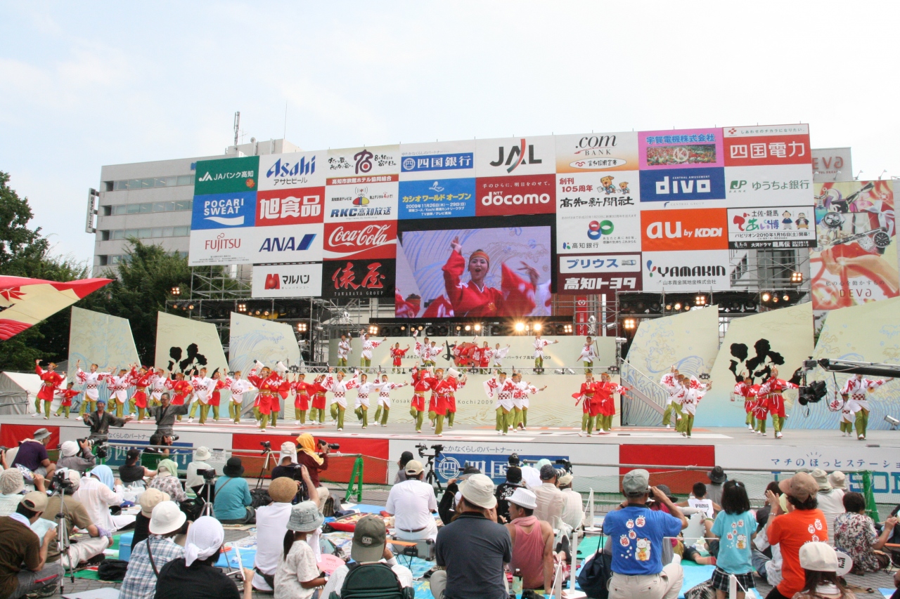 毎年8月9日(前夜祭)10日、11日、12日(後夜祭・全国大会)の4日間、高知市内10ヶ所の競演場・7ヶ所の演舞場で、約190団体・約2万人の踊り子が乱舞する高知を代表するお祭りです。約190の団体は、それぞれチームごとに華やかな衣装をまとい、独自にアレンジした曲に合わせて、鳴る子を鳴らして踊り、踊り子たちの先頭を行く地方車(じかたしゃ)は大音量で曲を流します。今や日本全国でTVでも見ることが出来ますが、本場の生のよさこい祭りの臨場感はテレビでは表現できるものではありません。地方車から大音量の音楽が聞こえて来るだけで、次はどんなチームが来るのか、胸が高鳴ります。この時期に高知に行くなら、絶対に見たいお祭りです。前夜祭の日には、鏡川河畔で花火大会も開催されています。競演場・演舞場は沢山ありますが、アーケードの下でサイドのお店から漏れてくるクーラーを分けてもらいながら見ることができる帯屋町商店街はオススメです(高知の夏はとても暑いので、炎天下で長時間見学するのは危険です)。夜になったら、すぐそばの中央公園の特設ステージでの乱舞を見るのもいいと思います。ステージになっているので、チーム全体を見やすいです。