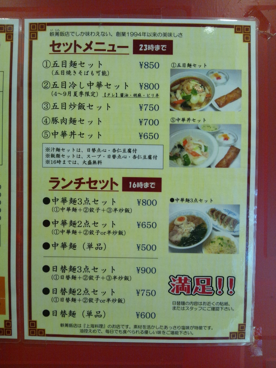 サンロードの中にある(本町新道との交差点辺り)低価格がうれしい中華食堂です。中華そばは\390、お気に入りの野菜たっぷりタンメンは\490、坦々麺(\580)や汁なしラーメン(\540)、カタヤキソバ(\560)、その他にも定食や炒飯、餃子、炒め物もあり、ほとんど\600以下で食べられます。季節の新メニューもあって、メニューは充実しているし、味もまずくはないです。ささっと安く食事をしたいとき(気分は中華)に重宝するお店です。サラリーマン風の方が多いですが、休日は小さな子ども連れの家族も多く見かけ、店員さんも子どもにやさしいので、子供連れでも入りやすいです。