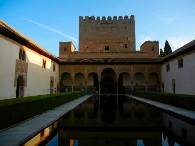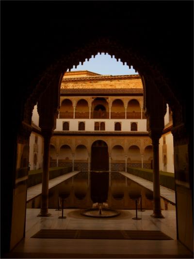 水鏡に映ったコマレス宮殿。いくつもの柱廊とアラベスク紋様の漆喰細工が美...