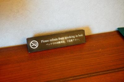 翌日のインのため、さっさとお風呂を済ませ就寝しようとするとベッドに「ベッドでのお煙草はご遠慮ください」のプレートが。