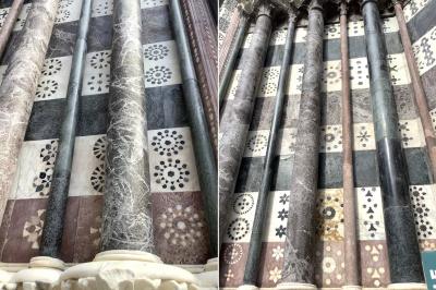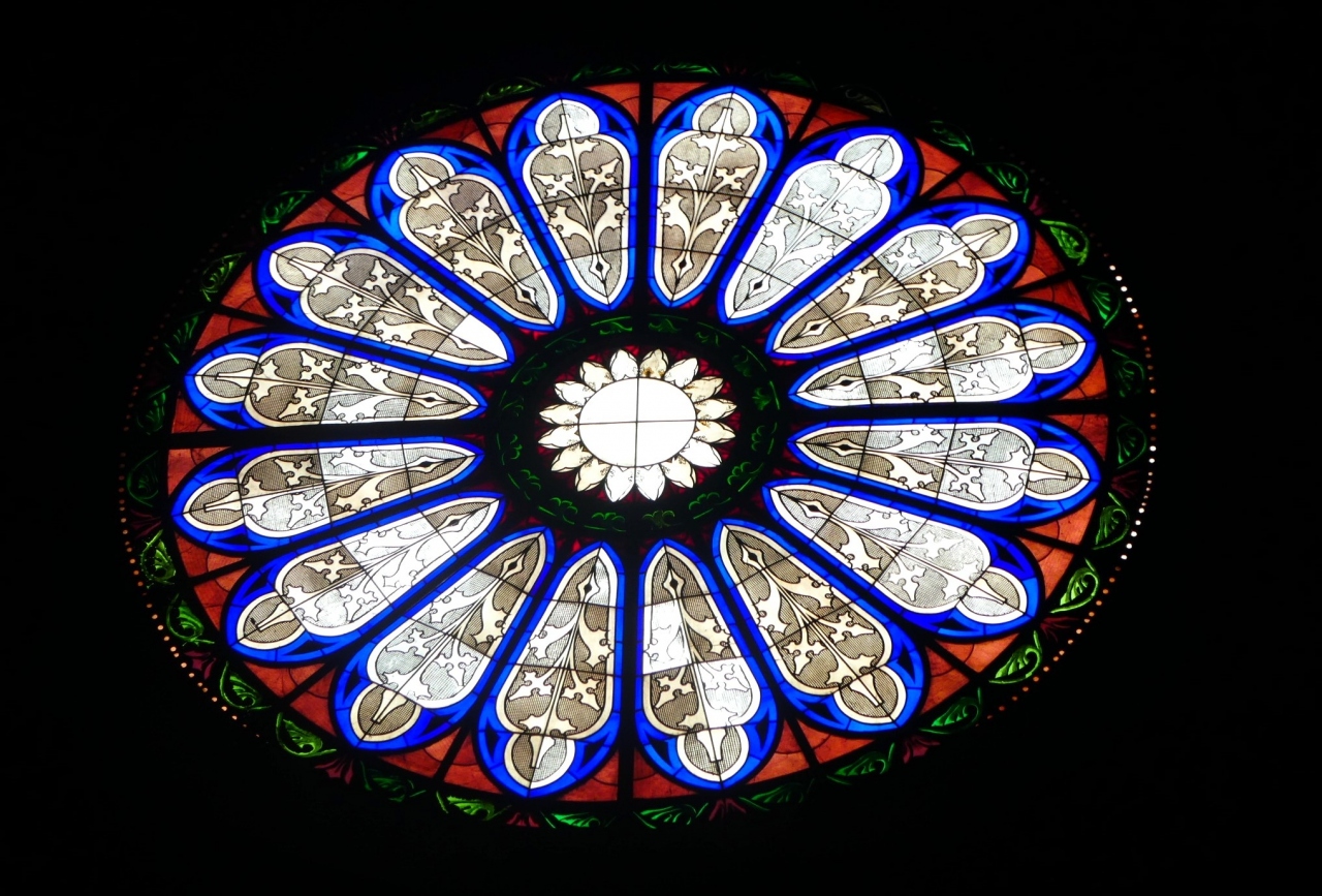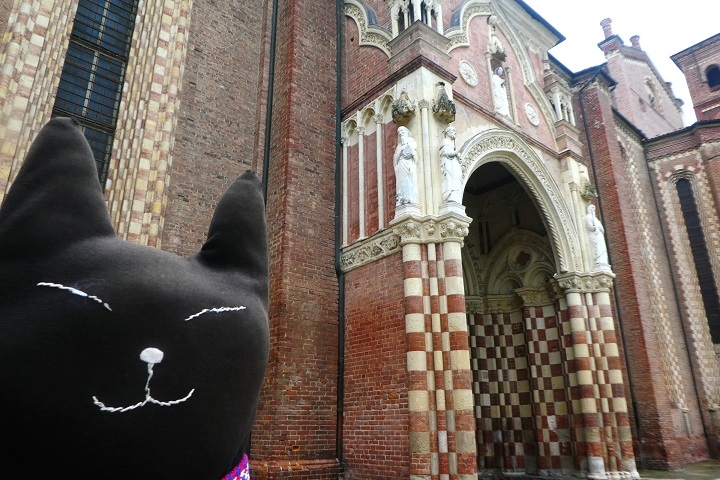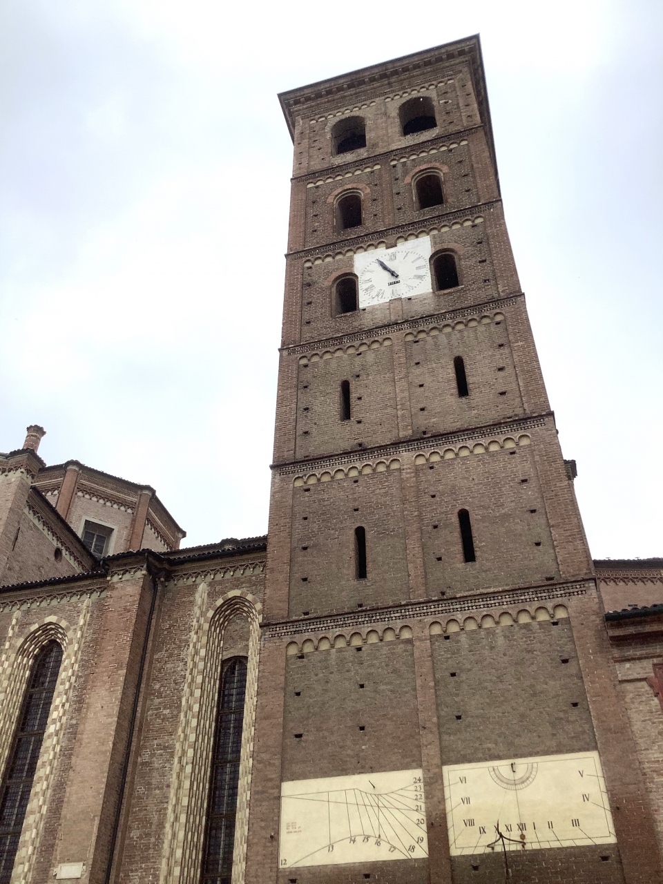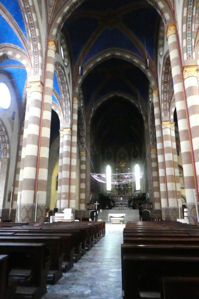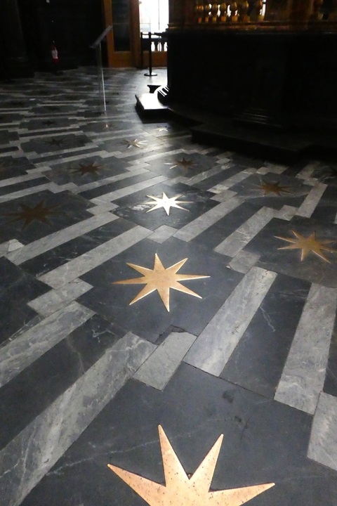 外観はしましまというか市松模様のゴシック様式で、南面に立つ塔の壁面にある日時計がナゾでした。右はフツウにローマ数字でⅥ~Ⅴとあり、これは朝6時から夕方5時までか、とわかるんですけど、左の方はアラビア数字で12~24とあり、何をどう測るんだか…。あ~、現地ガイドさんに訊くんだった!