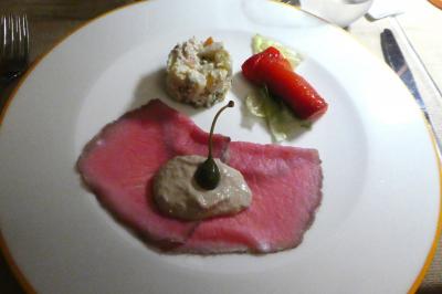 前菜に食べた牛肉のツナソース、ロシアンサラダ、赤ピーマンのマリネの3品はお店のサイトのメニューにも載っている15ユーロのものだったようです(Piatto della Tradizione)。