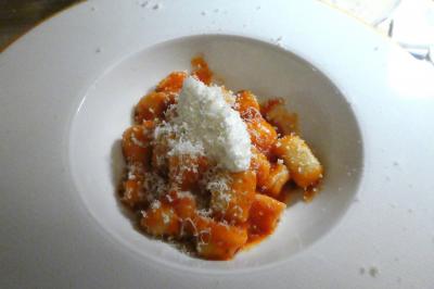 メインはトマトソースのニョッキにブッラータ(Burrata)というフレッシュチーズがトッピングされたもの。ブッラータは細かく裂いたモッツァレラチーズと生クリームをモッツァレラチーズで包むという手の込んだチーズ。へ~~、でした。ただのクリーミーなチーズ、美味しい♪と食べてましたけど、製造方法を知ったらもっと感激していたかも。