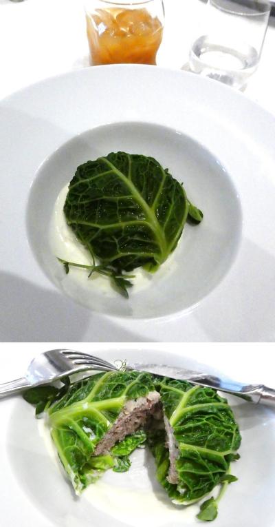いただいたのは前菜にカプネと呼ばれるロールキャベツ。キャベツがしわしわ縮緬のサボイキャベツで、ひとりコーフン。サボイキャベツのサボイってサヴォイア家のサボイですよねえ…。