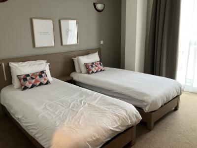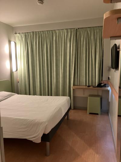 部屋は変形した形。ベッドが1人でも二段ベッド。室内の冷房はよく効きます。窓が二段ベッドの上の方で眺望は全くなし。夏のこの時期に寝るだけの一泊なので新しいだけマシかと。- 旅行時期