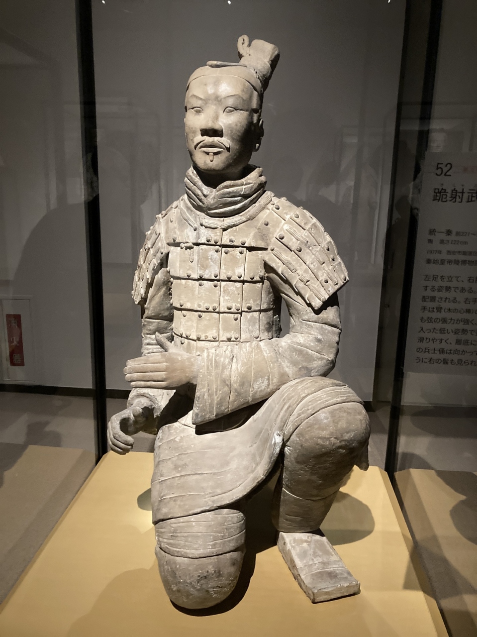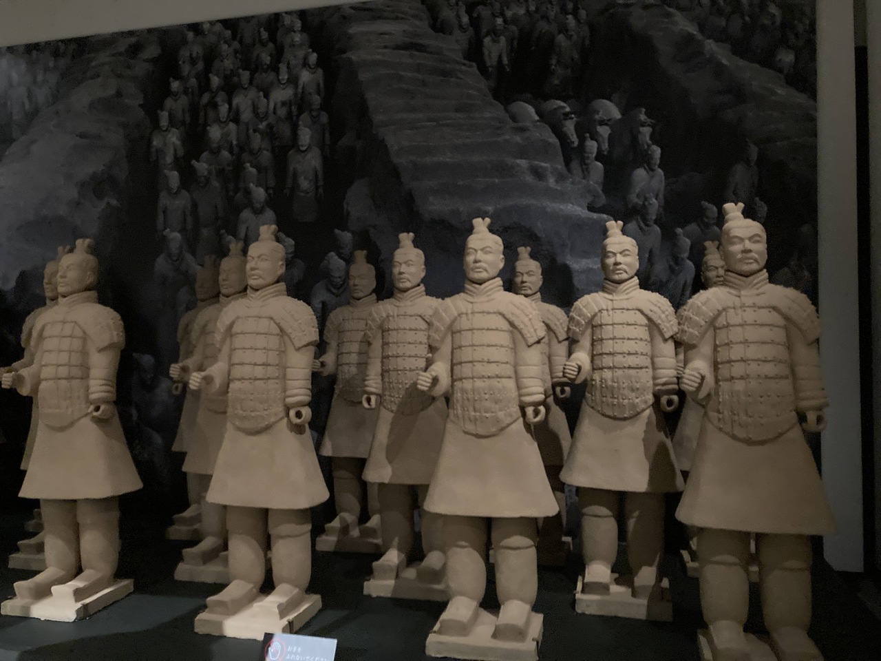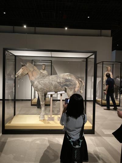 兵馬俑自体は少なく、跪いて弓を持つ武士俑一体と馬、そして10数体の武士俑が展示されていました。他は春秋、秦などの古代中国の出土物、剣、器などでした。