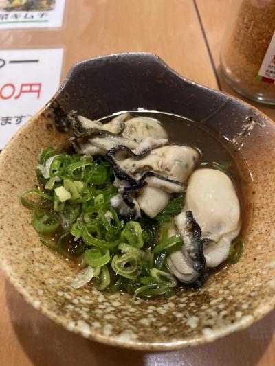 おつまみに広島牡蠣を食べてみました。加熱されているプリッとした牡蠣を酢醤油で食べました。このいつでも牡蠣を提供できる、というところが「ザ 広島県」という感じがしました。- 旅行時期