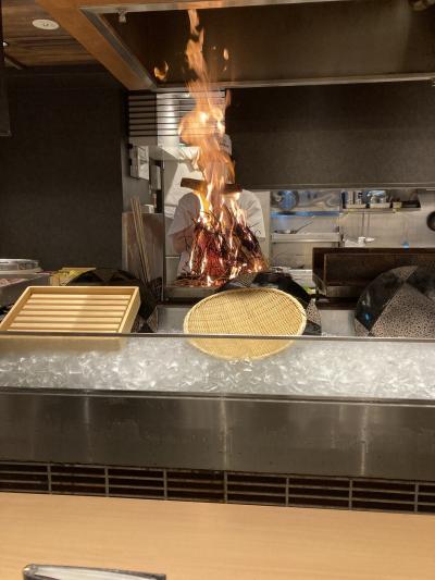 諦めて南口の方で見つけたのがアスティ。この中でこの店を選択。魚介類を楽しめるチェーン店です。カツオの藁焼きの実演がポイントでした。1メートルくらい炎が上がっていて見ているだけで気分も上がりそうでしたよ!