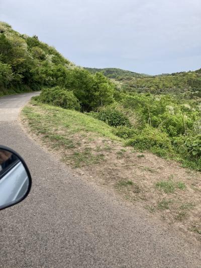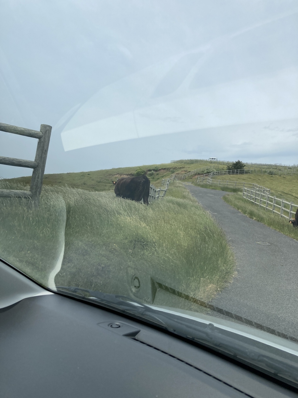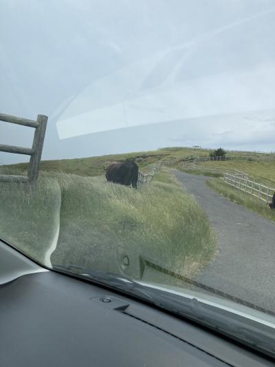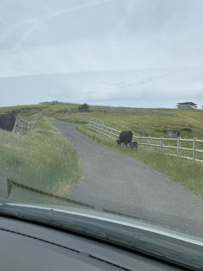 島の人口600人に少し少ない500頭の牛を自然放牧し育成している島なので、この山のあたりは360度放牧地になっています。崖から牛が落ちないように柵があったり、車道にも牛の自由な移動を阻止するような工夫はされています。が、自由気ままな牛はそんなこと気にせず自由にのんびりと草を食んでいます。注意して運転する必要があります。