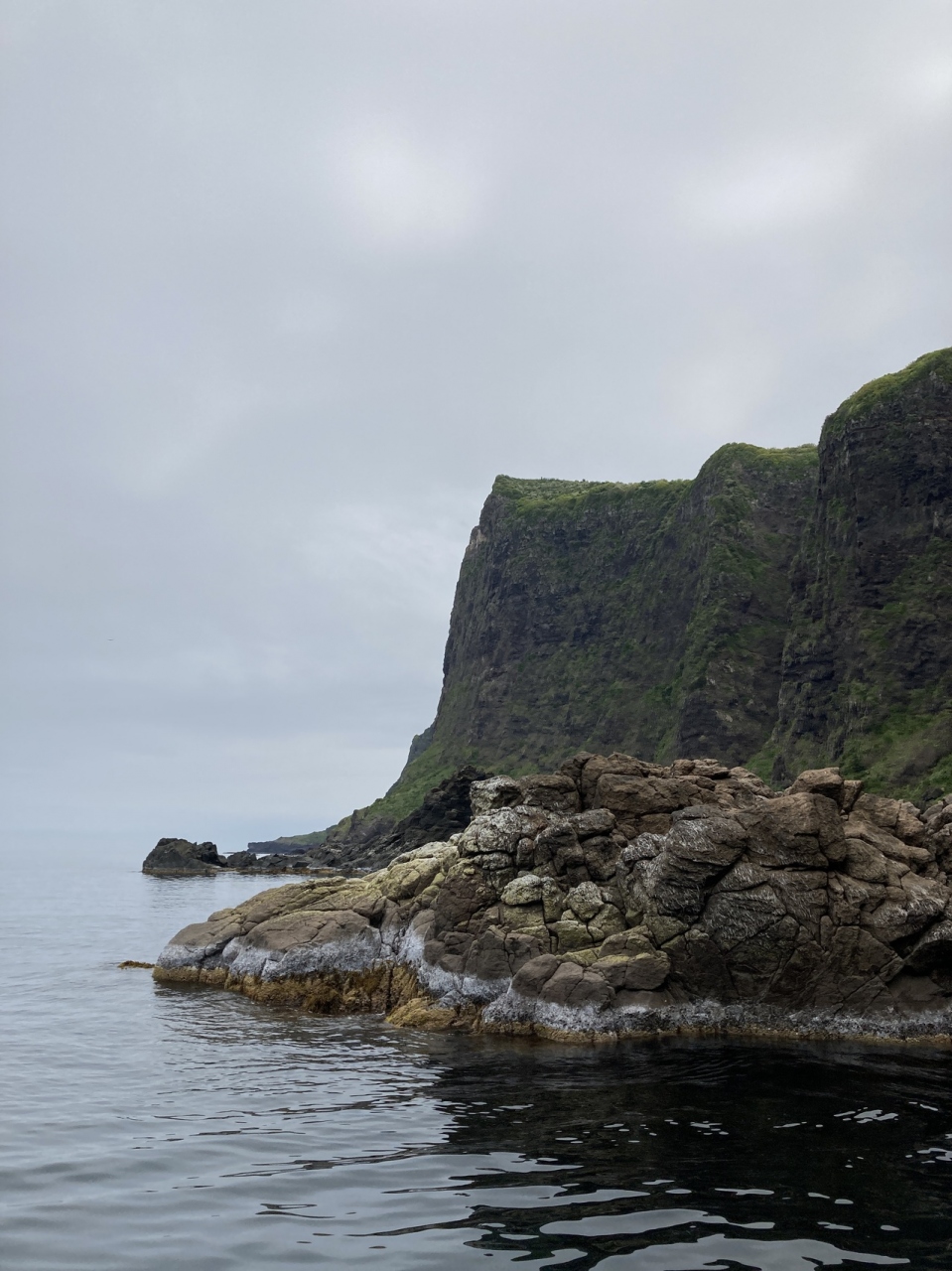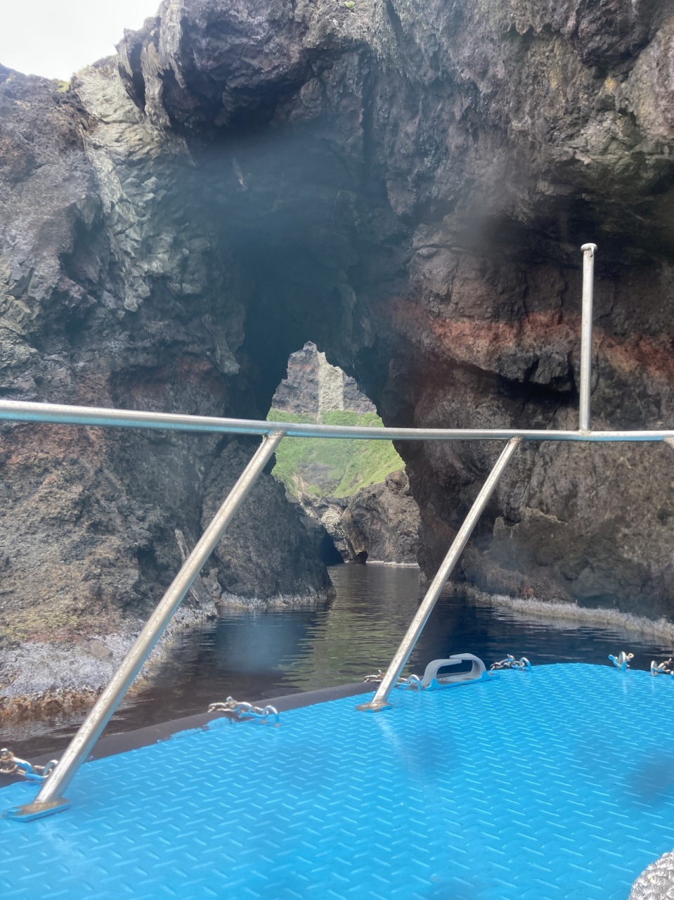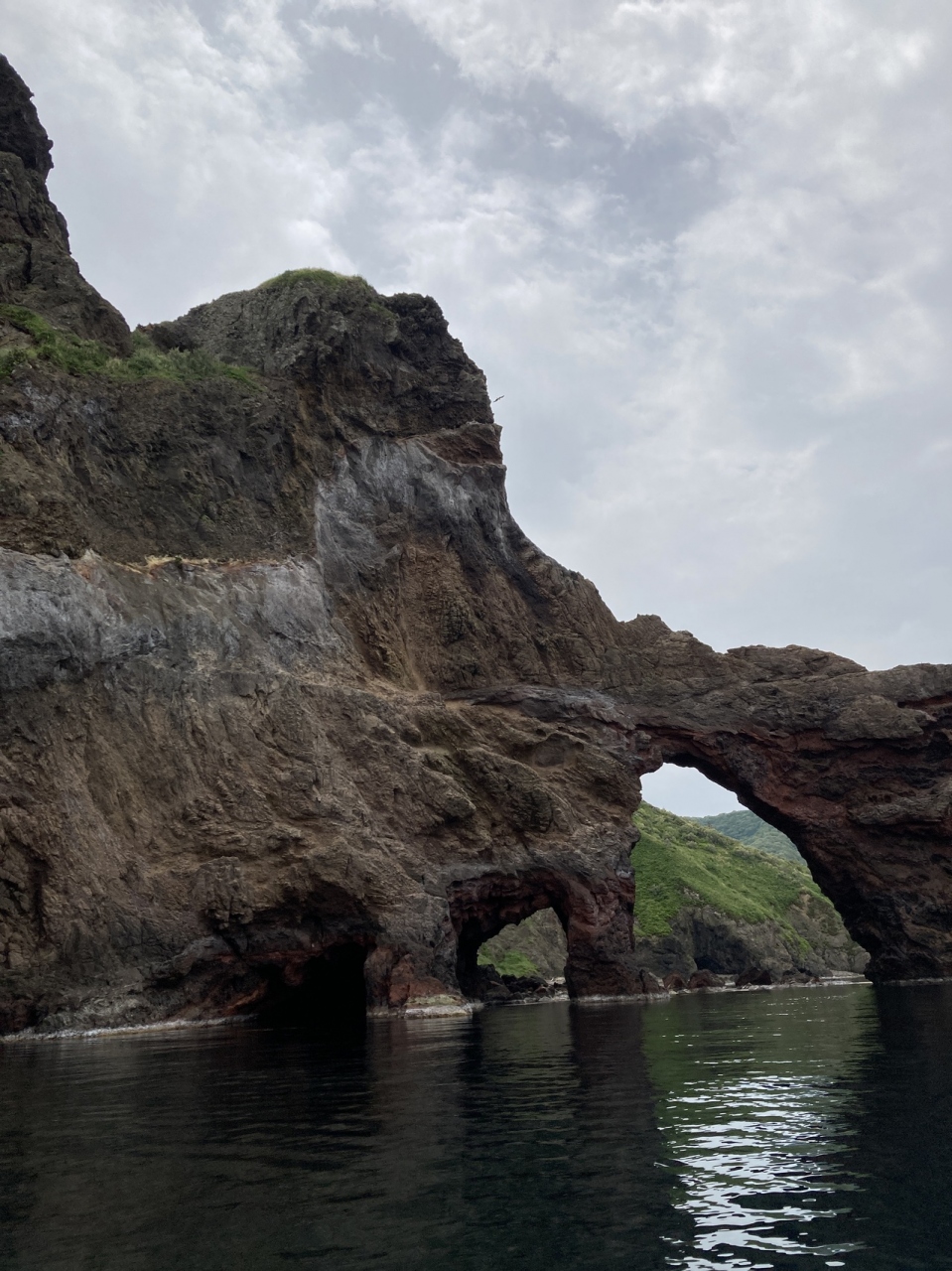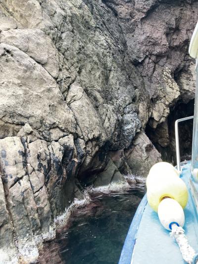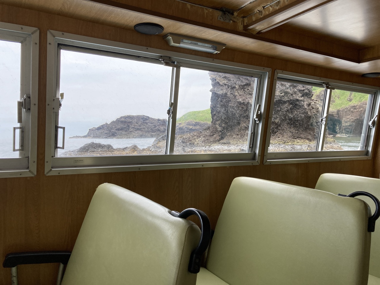 その日は朝から雨模様との予報でしたが観光協会から推薦されて乗船しました。絶景の魔天崖や奇岩を海側から見るのも良いなぁ、程度の期待でした。