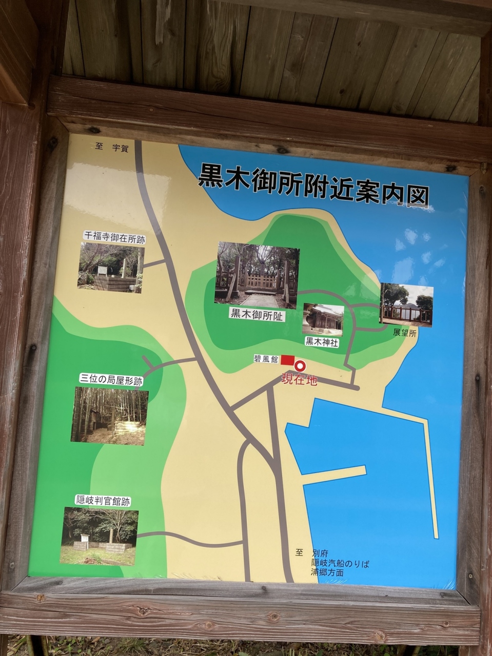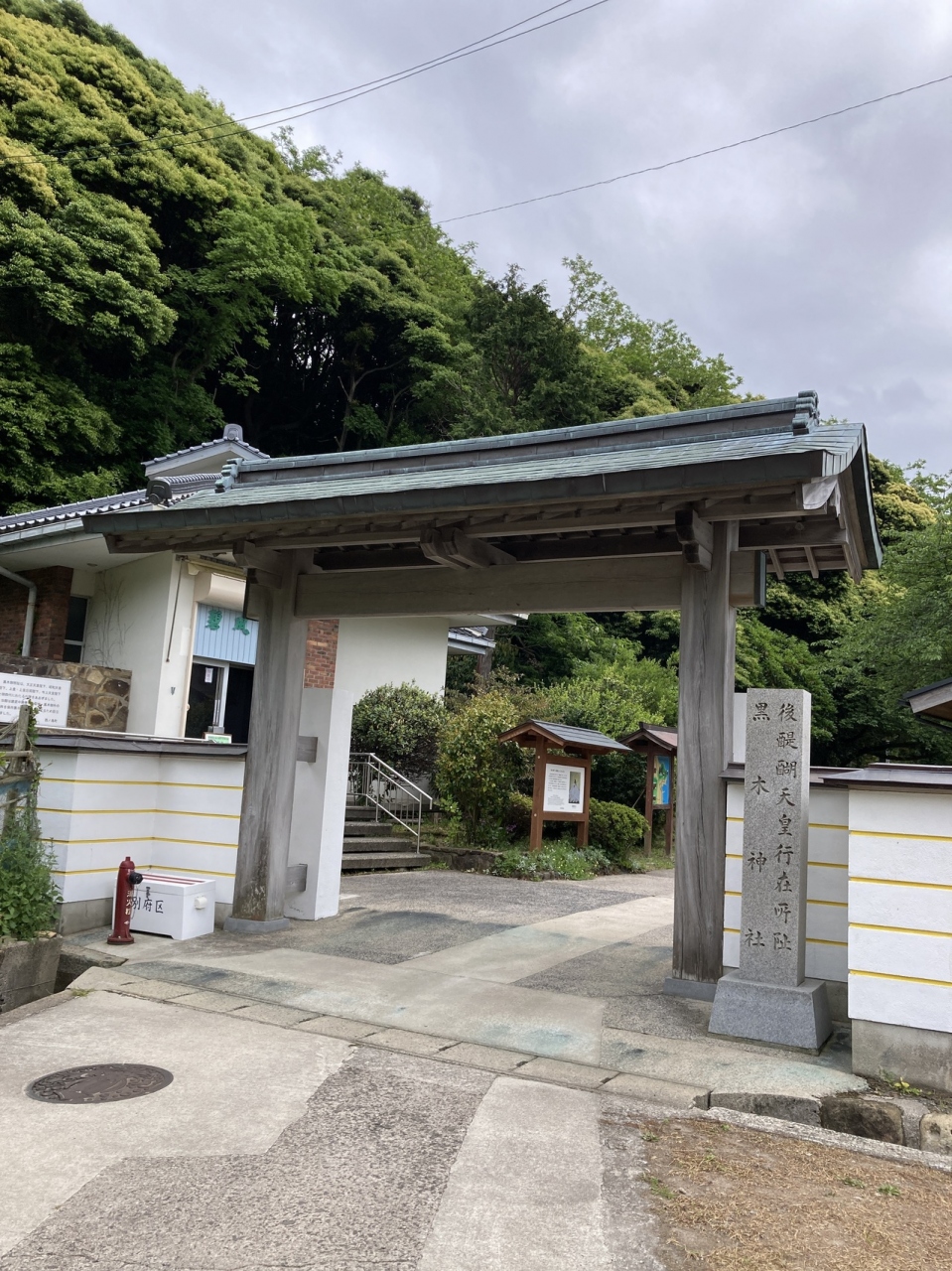 ここは別府湾を臨む小高い丘の麓にあります。丘の上には黒木御所といい、隠岐島に配流された2人目の上皇、後醍醐天皇が一年と少し住んでいたところです。別府湾の反対側には鎌倉幕府の見張がいる島がありました。