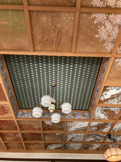襖絵はこれまた若い写真家、杏橋幹彦氏による斬新な海の写真。海の青がとても強くて目を引きます。ほかに部屋は忘れましたが天井には四季の絵が書かれています。
