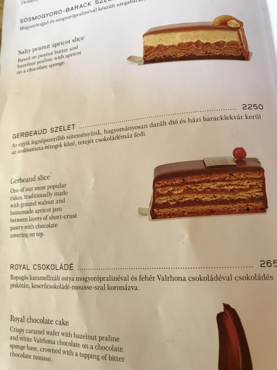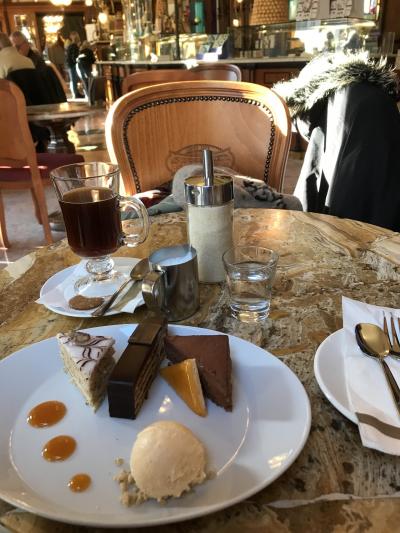 こちらの売りのもう一つは、ハンガリー国民に人気のフランツ・ヨーゼフ1世の后、エルジェーベトも良く食したと言うスィーツを中心に頂くことができることです。スポンジにジャムやクリームを挟んだもの。さらにその上からチョコレート等でコーティングしたものなどが多いです。お味はやはり現在のスィーツから比べるとそれなりでした。- 旅行時期