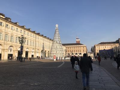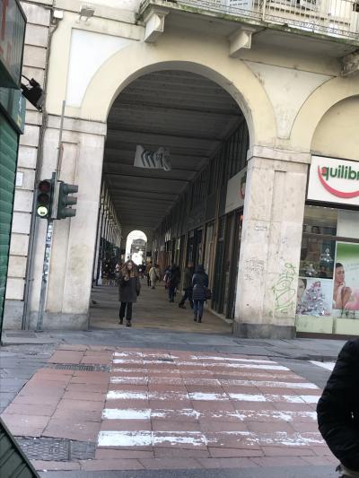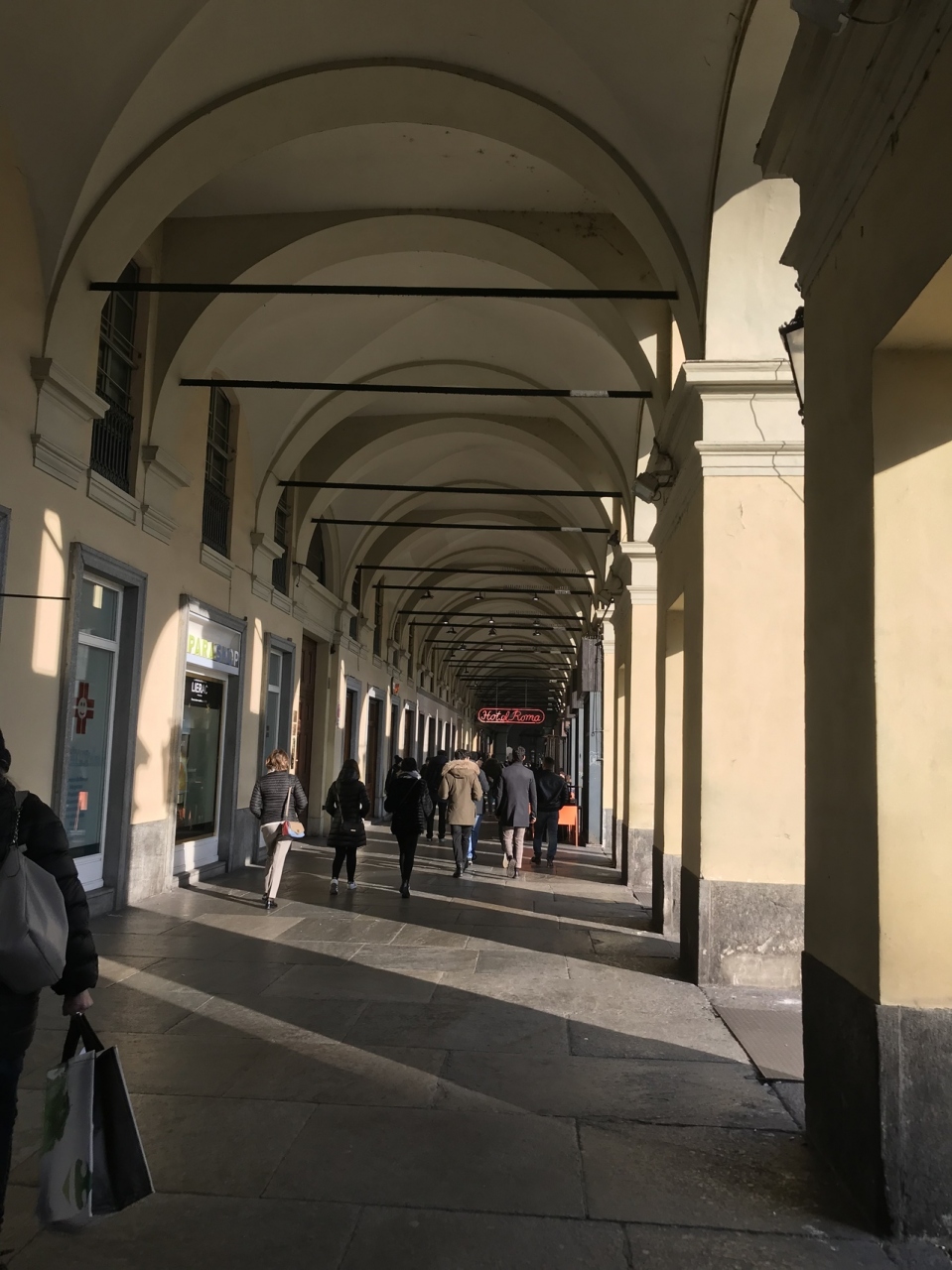 サボィア家の王宮のある町トリノのポルティコは、計画的な街作りで作られた通りに沿って整然と並んでいます。もともと古代ギリシャ帝国の町に現れたポルティコですが、天候が悪くても歩きやすく、また日照りを遮断してくれるのでイタリアの町にはよく見られます。が、トリノのポルティコはその長さ故にさらに有名です。総延長18キロだそうです。歩く時は天井の装飾などにも少し見るとそれぞれ異なってなかなか興味深かったです。天井はとても高いので圧迫感などは全くありません。