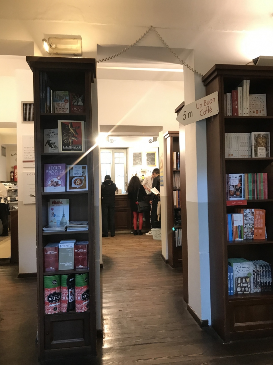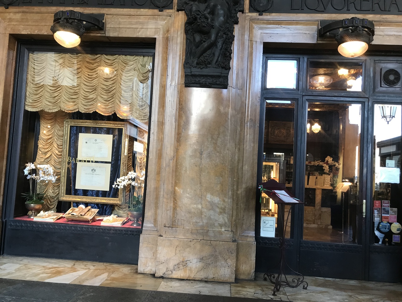 カステッロ広場のそばにあるポルティコにある老舗のカフェです。ドアを開けて入るとまずはチョコレートやほかのケーキやお菓子を売っています。