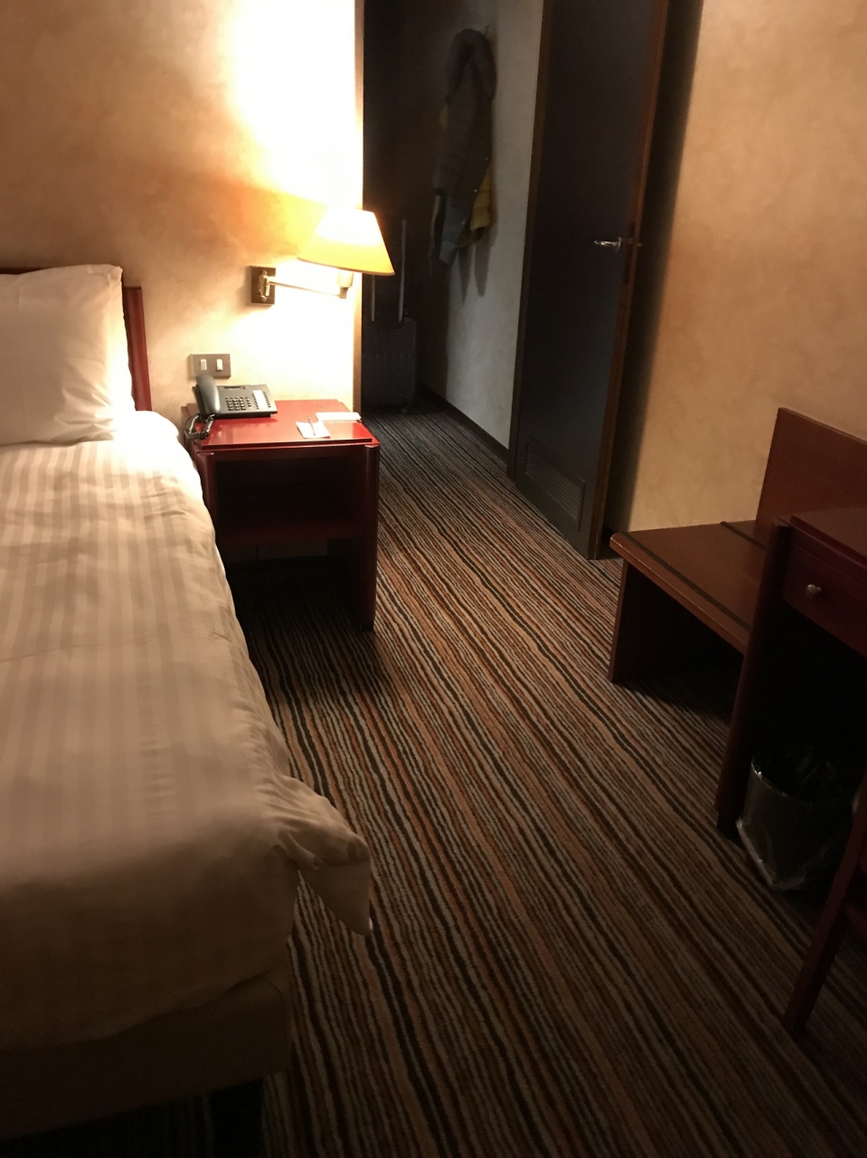 そして、グーグルマップで確認した通り、駅舎を出たらメインロータリーの向こうにこのホテルの看板が煌々と浮かび上がっていました。にもかかわらず玄関が分かりづらく通り過ぎてしまいました。駅前のちょっと雑多な感じで人に聞くのもビビりましたがちゃんと教えて頂けました。