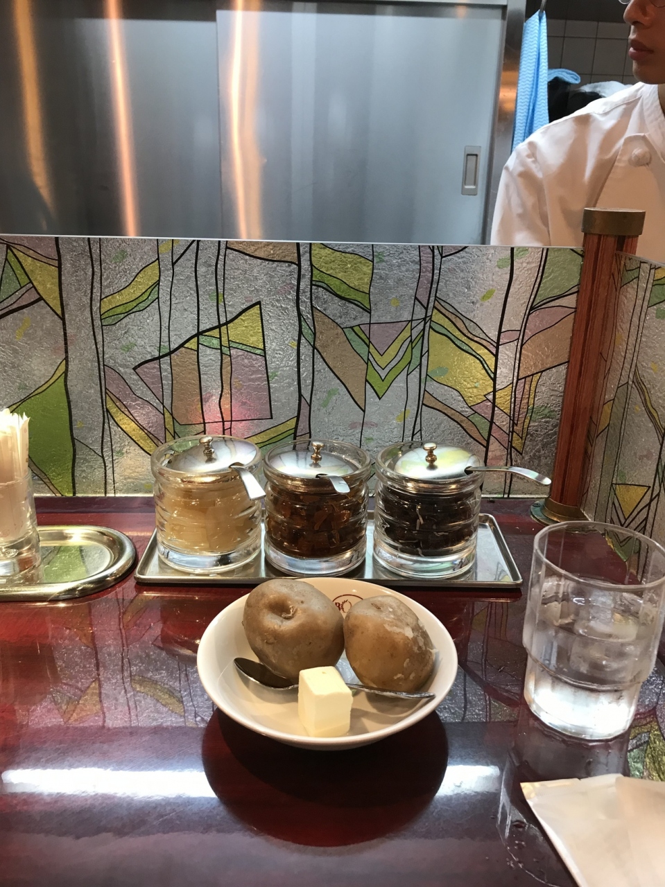 カウンター席に座るとほどなく出てきたのはポテト二個とバター。これは先代が満腹になってもらおうと思って出したとか、、、。しかし今回少し時間が早かったこともあり、実はお腹が空いていません。なので、手をつけず。毎日1000個ぐらい仕込むらしいです。