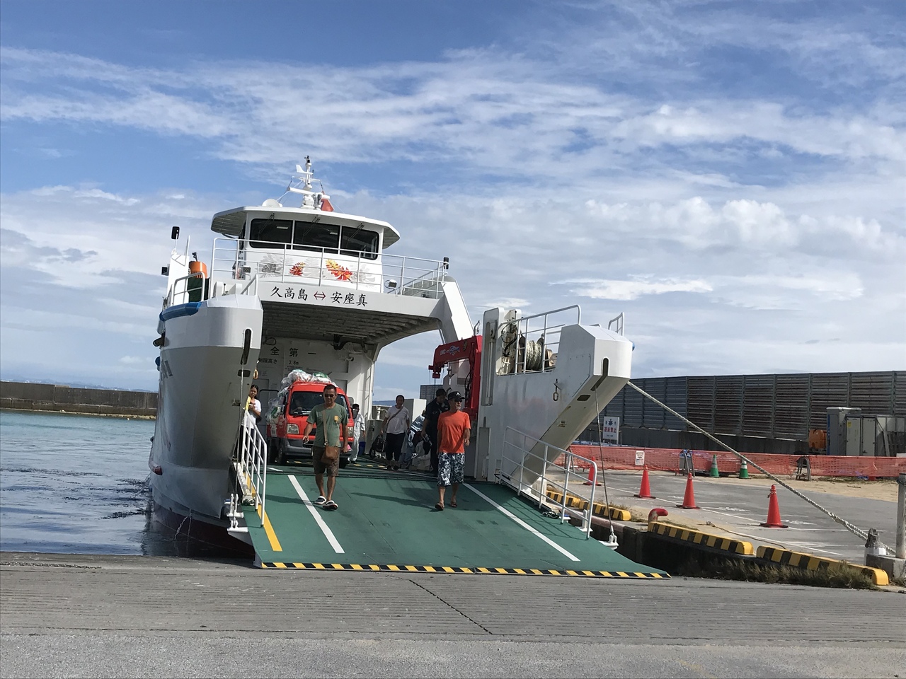 安座真港には十分な駐車スペースがあります。またターミナルにはチケット売り場、待合室、トイレのほか、特産品売場があります。