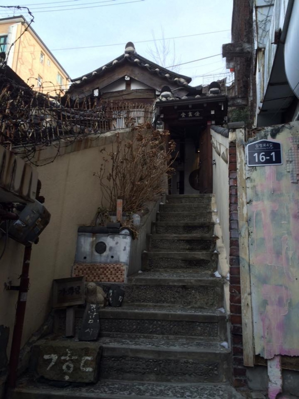 伝統家屋の多い三清洞(サムチョンドン)を歩いていると細ーい階段が。なんとなく登っていくとステキな伝統家屋の門構え。門を入ると小さいながらきれいに整えられた庭がある。