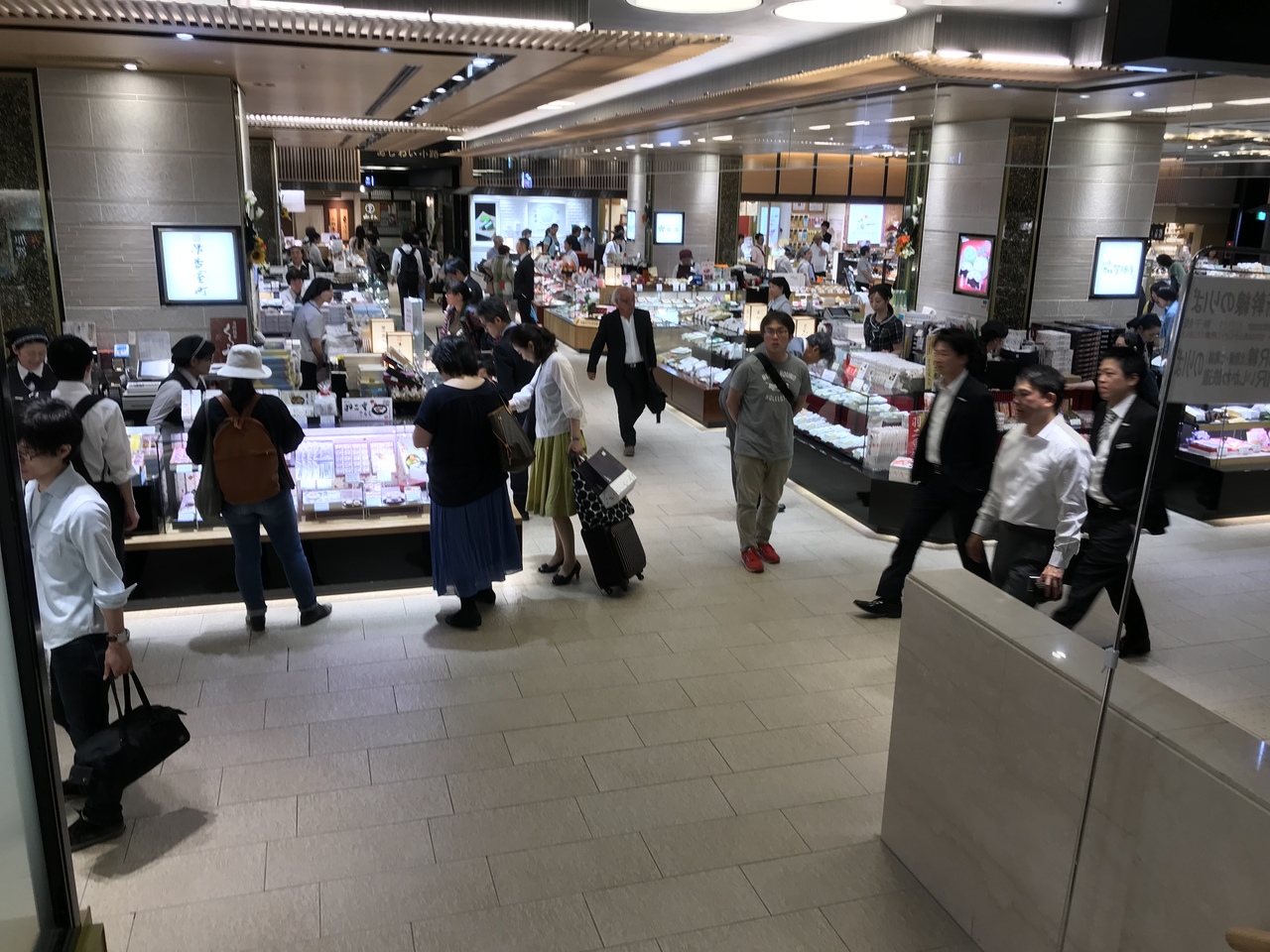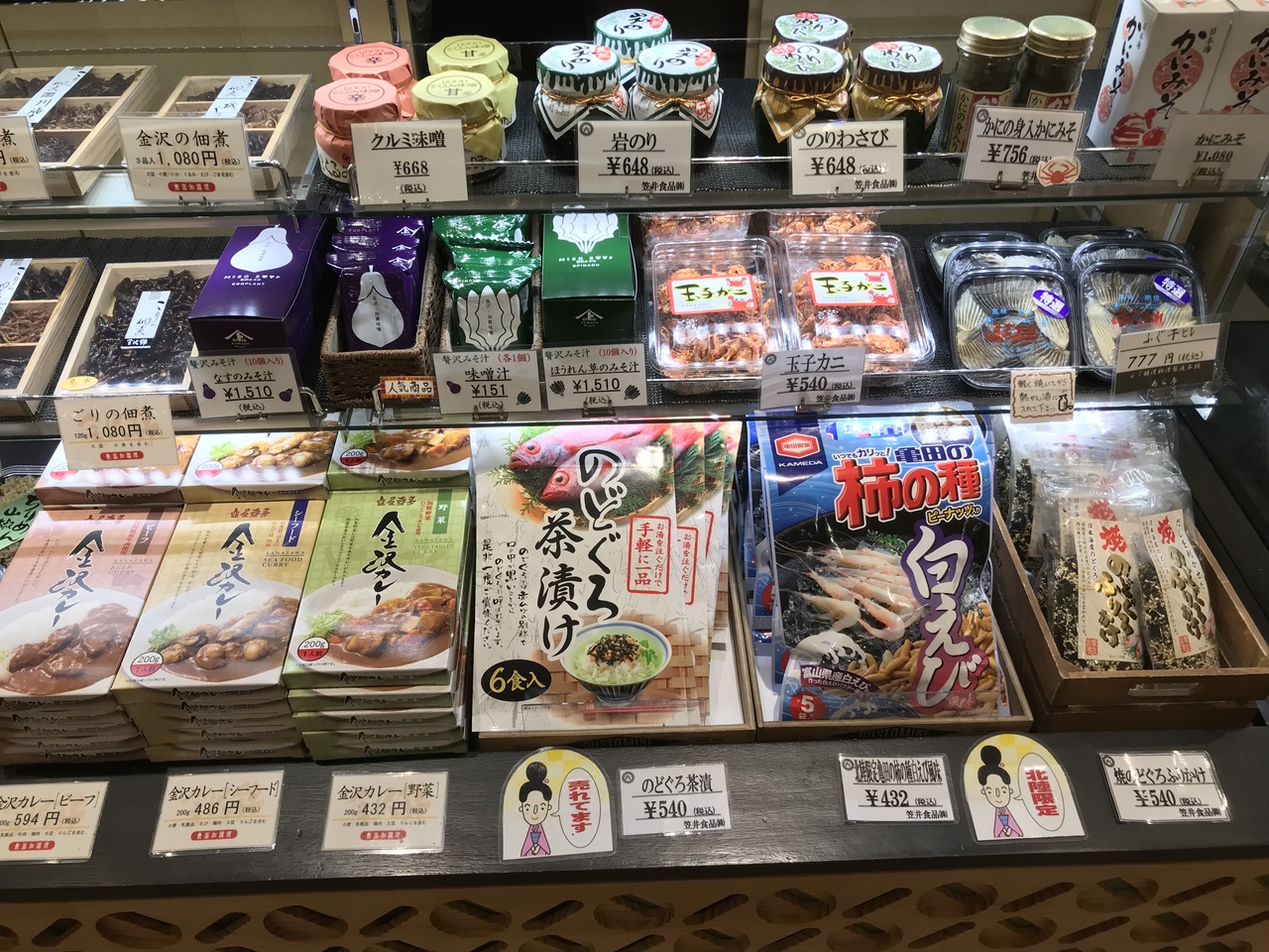 新しいJR金沢駅には、「あんと口」ともいうべき改札口があります。そこを出ると、お土産やグルメの名店がズラリと待ち構えています。和菓子、地酒、山海の幸、工芸品が一堂に揃っています。もう、見るからに美味しそう、高級そう、選び抜かれている感が漂っています。