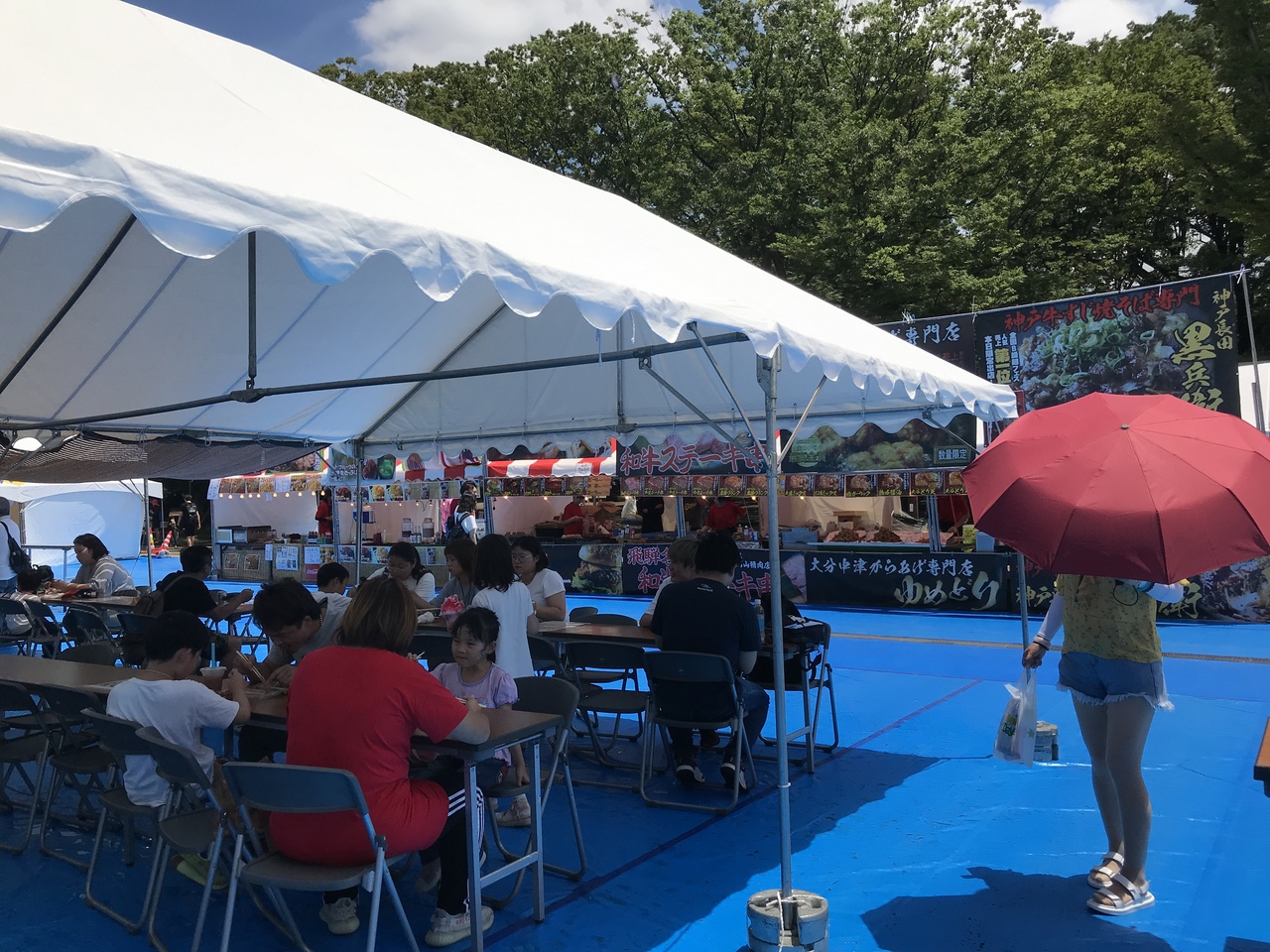 飲食スペースは大きなテントの下にあり、近くで作りながら販売している食べ物を購入して座って食べられるようになっています。そしてステージの催し物を食べならが見ることができます。