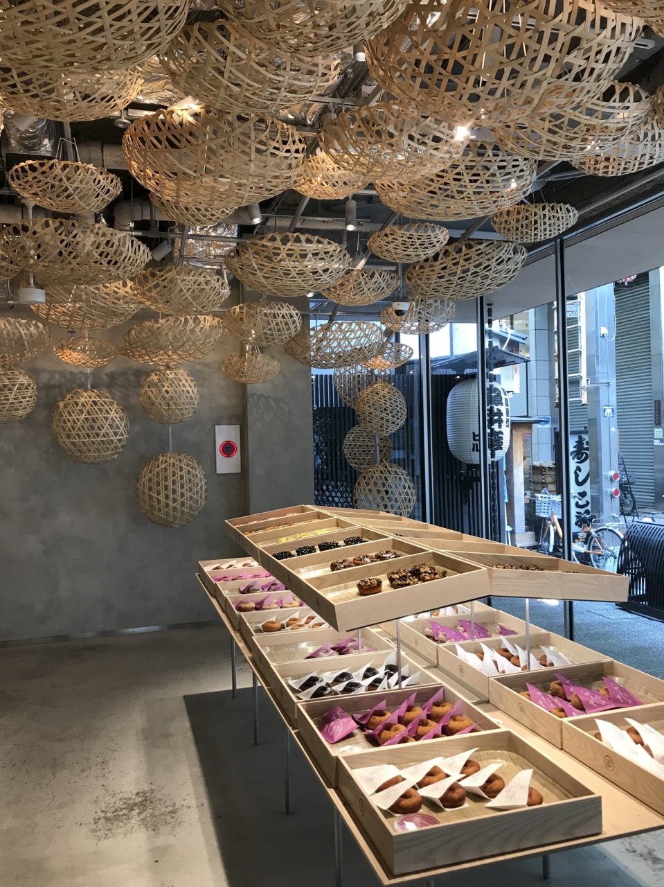 その一階に、モダンだけれど、伝統的・京都嵐山の竹細工・六ツ目編みのカゴとコンクリート打ちっ放しの空間、コエドーナツがある。