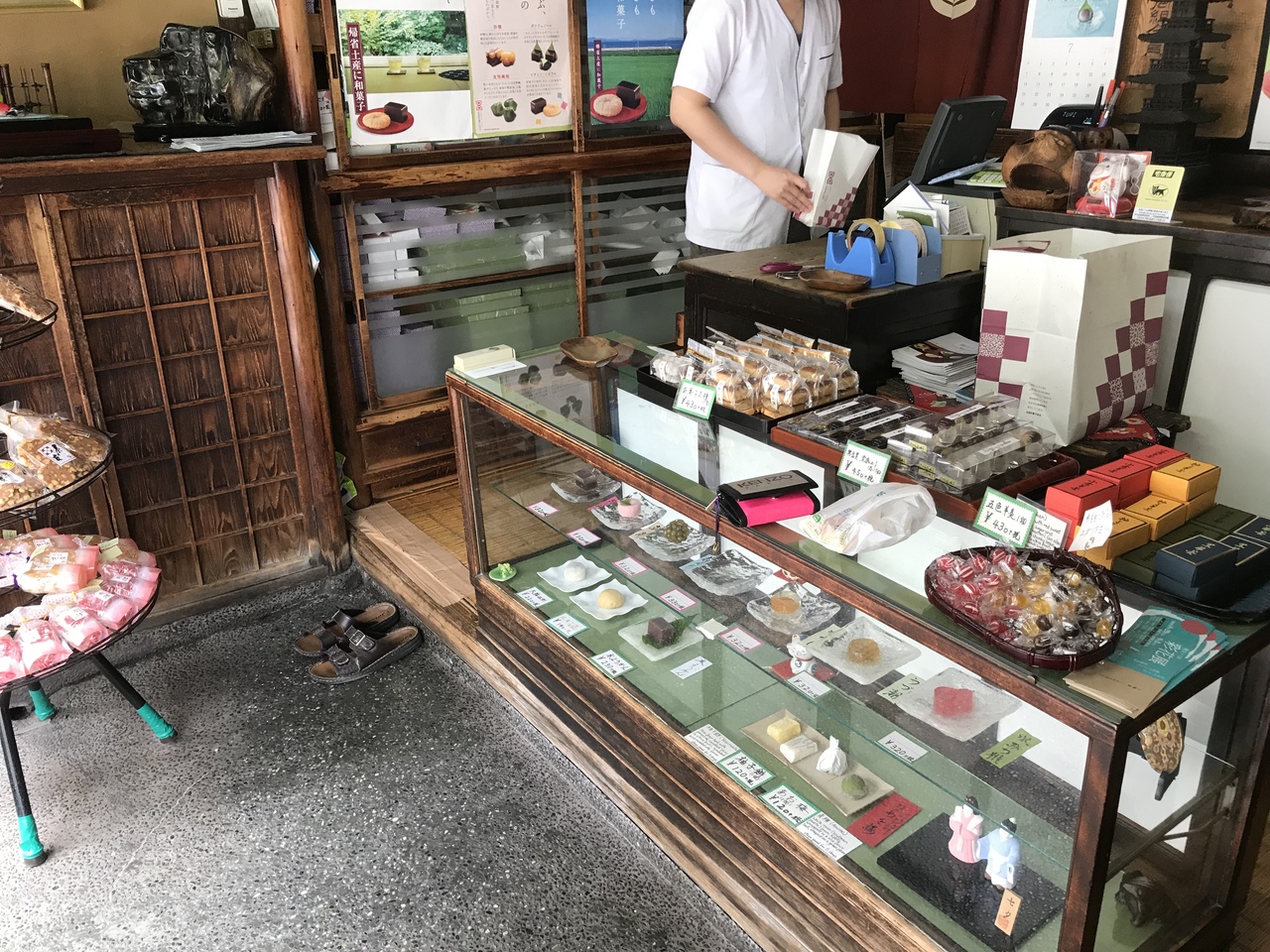 谷中の古い和菓子屋さんです。お店の両側はピッタリくっついています。道が狭いので、歩道は片側だけ。みんな譲り合いです。