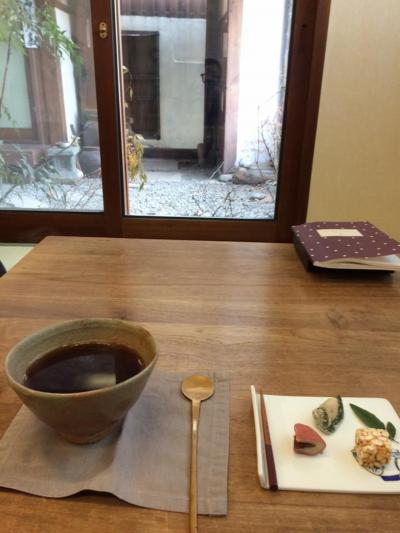 玄関を入ると落ち着いたカフェ。靴を脱いで、庭の見えるテーブルに座る。座布団が用意されている。