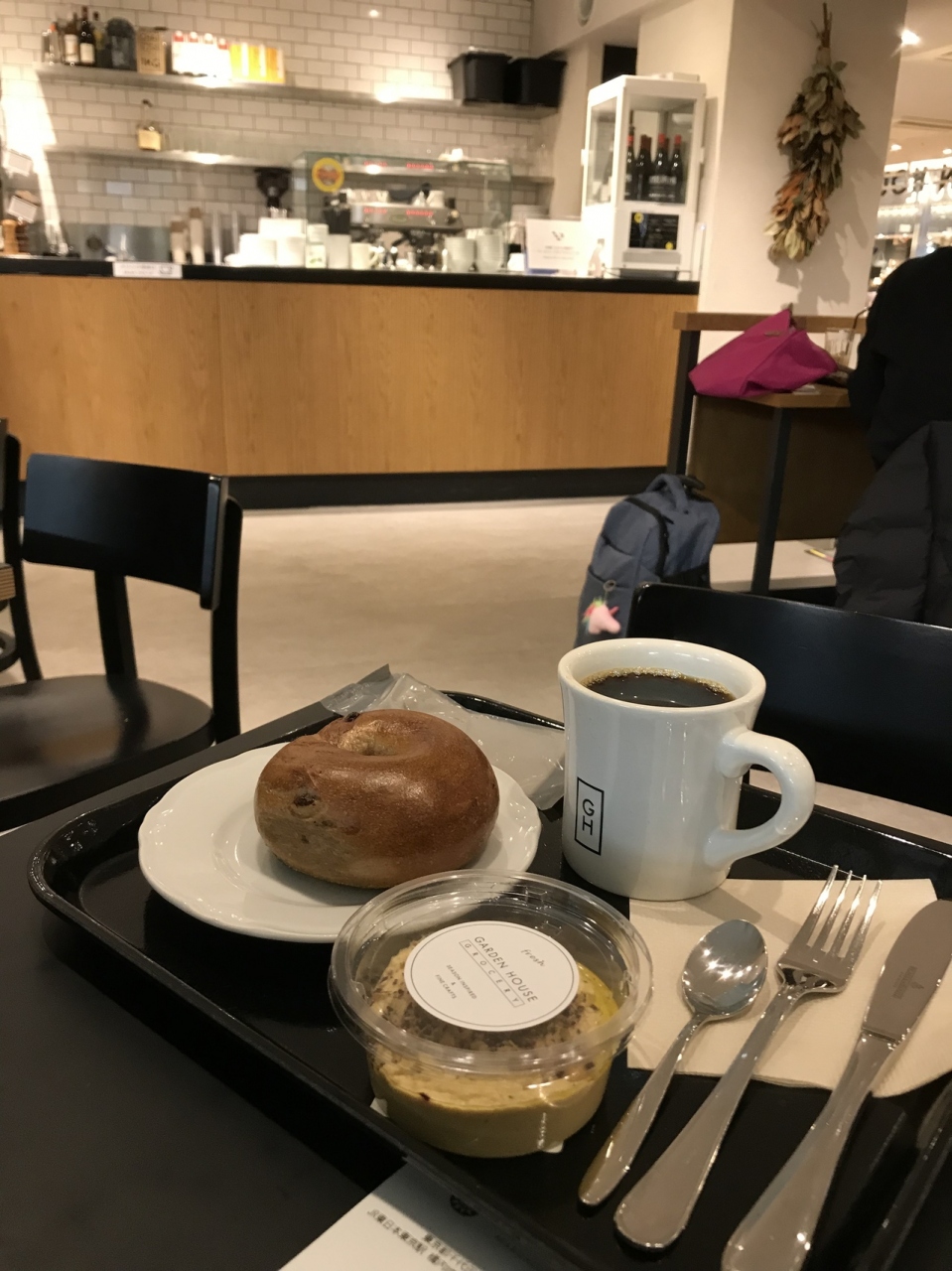 パン屋さんでさまざまな種類のパンを販売しています。その奥が広めのカフェスペースです。床は木製で地下とは思えない圧迫感の感じられないスペースです。- 旅行時期