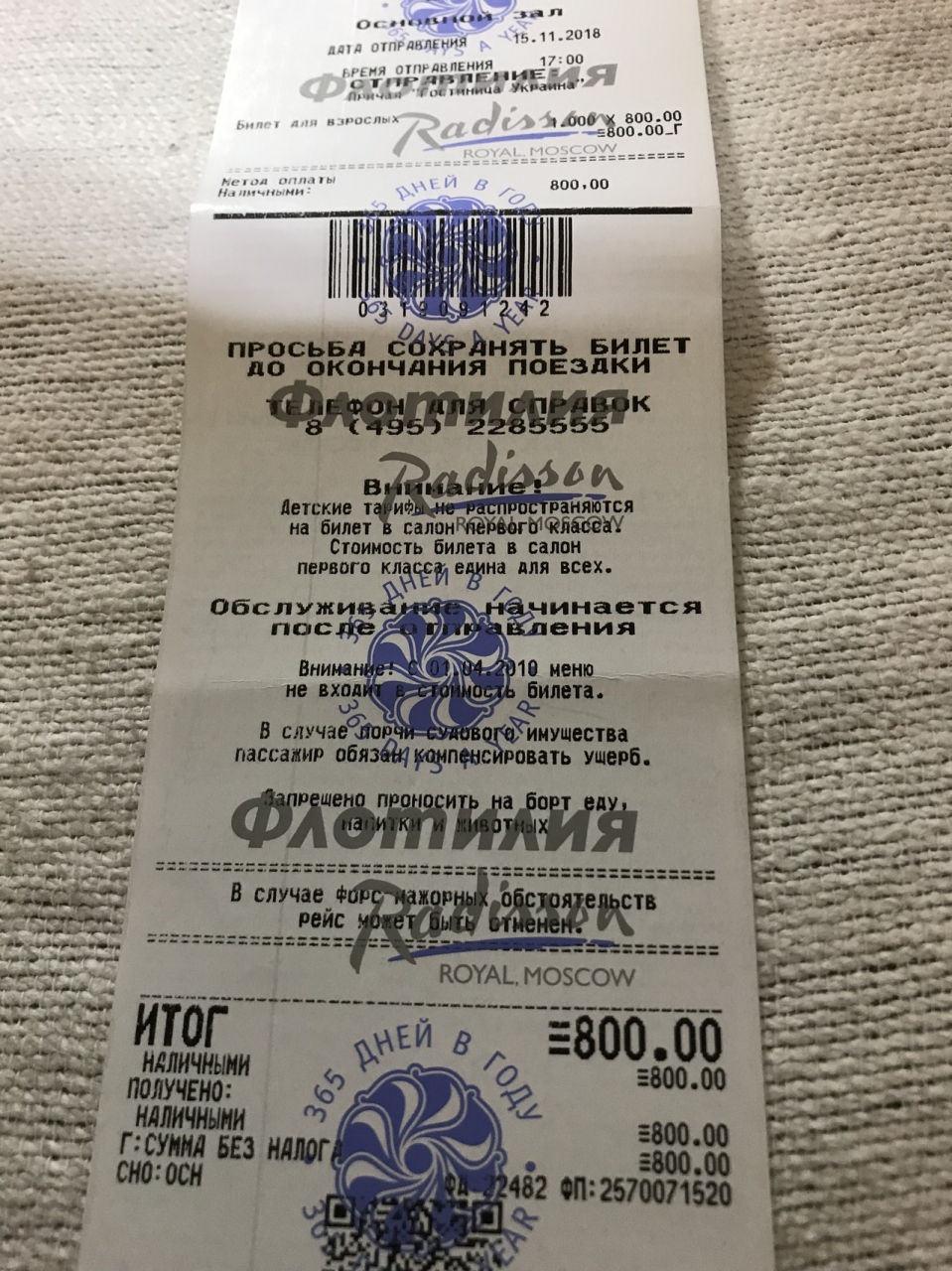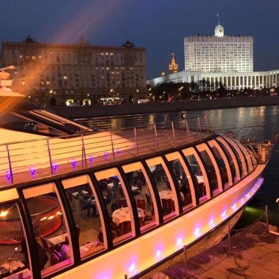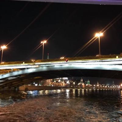 通常なら、キエフ駅から川へ向かうと歩行者橋が見えてくる。それを途中で降りて川沿いを行くと各社のクルーズ船乗場がたくさん並んでいる。残念ながら冬場はほとんどがクローズしている。更に川沿いを約1キロほど行くと、スターリングクラシックで知られる旧ウクライナホテルが見えてくる。現在はラディソン・ロイヤル・ホテル・モスクワである。歴史的建築の見事さを残しながら全面改装された五つ星ホテルである。このラディソンが運営するのが最新クルーズ船である。川沿いにチケット売り場があり、800ルーブル。簡易なクルーズも運行していることがあるが、こちらは料金は半額だがなにせ寒い。一方、この豪華クルーズではテーブル席で食事付きもある。飲み物だけを注文してもいい。夕暮れに段々とライトアップし始め、モスクワ中心部のライトアップを楽しみワインなど飲んでいるうちに2時間はあっという間にたってしまう。冬のモスクワでもおすすめだ。- 旅行時期