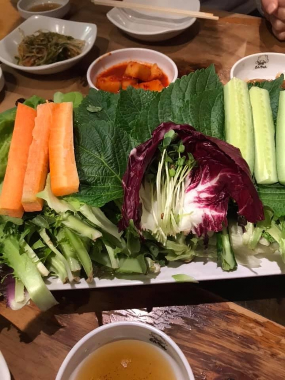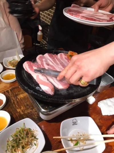 人気のメニューは、元祖サムギョプサル。豚の三枚肉を焼いてエゴマに巻いていただくもの。