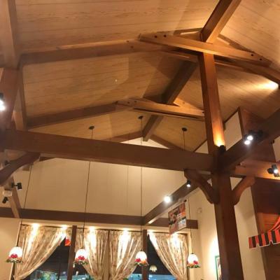 室内は天井が高く、広々とした4人掛けが連なっています。