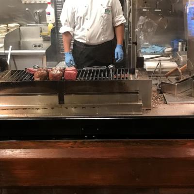 入ると右手にオープンキッチンで、ガラス越しに肉を整形し焼いているところを見ることができます。