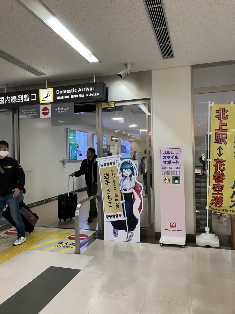 岩手県花巻市にある地方空港で小さいです。到着は一階、お土産屋さん他ありましたが、伊丹空港から乗って来た飛行機が遅延のため、乗り継ぎバス(アクセスバスというらしい)に急いで乗り込みました。小さい空港だと迷うことがなくて、便利です。