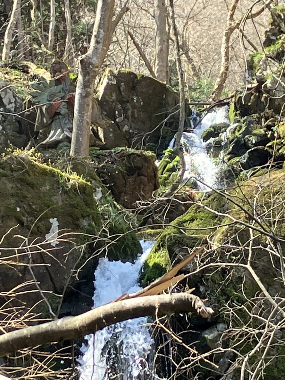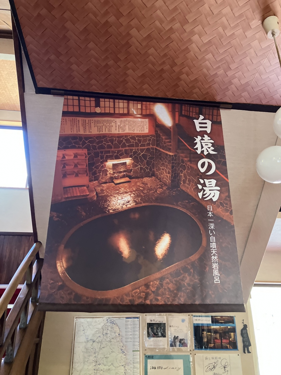 さらにここには珍しい立ち湯「白猿の湯」があります。階段から見ると下の方に丸い湯船がみえます。自噴自然岩の湯で深いところは125センチもある立ち湯です。昔ながらの混浴ですが、宿泊すると女性専用の時間がありますので安心して利用できます。