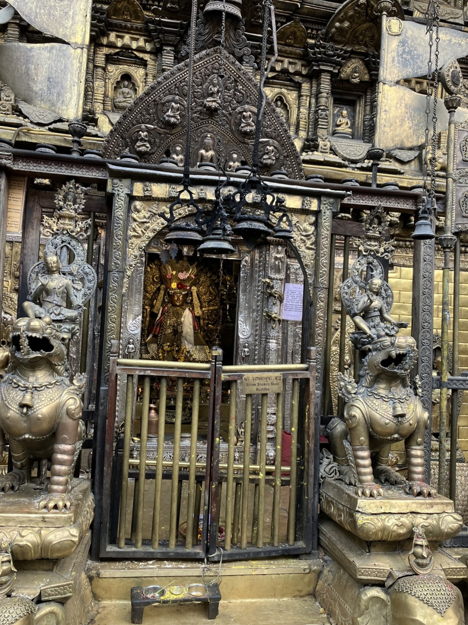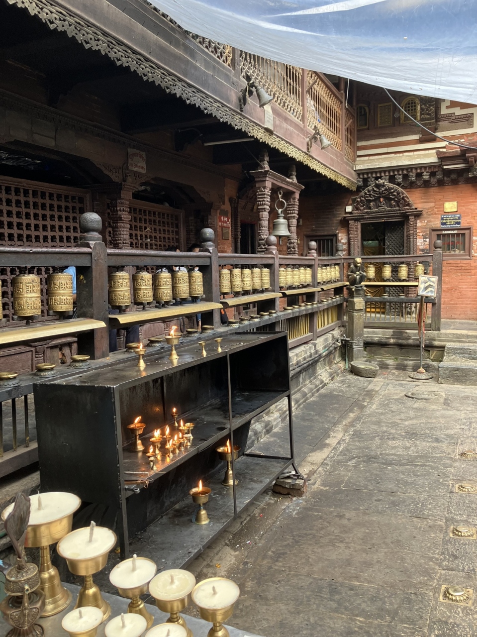 入り口には狛犬みたいな像が立っています。中に入るとスペースいっぱいに金色に輝く寺院やマニ車があります。いわばネパール版金閣寺みたい。ただ建物に囲まれた空間いっぱいに建てられているため、その全容を愛でるのは大変です。