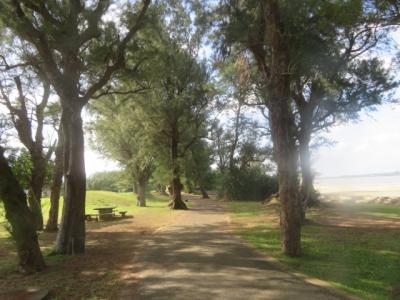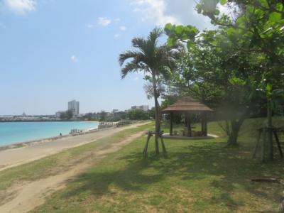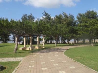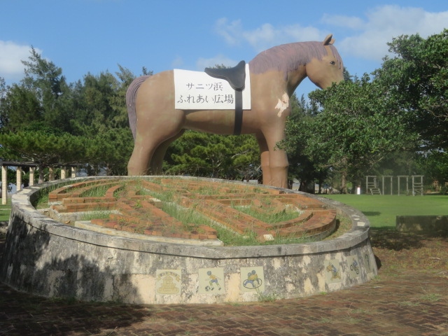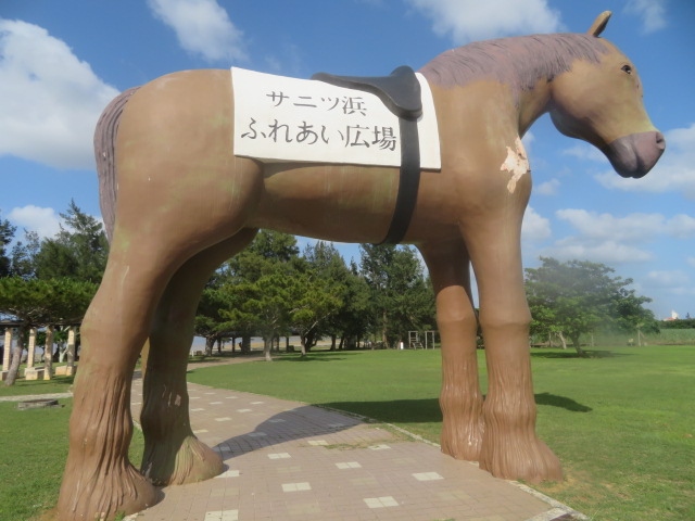 与那覇湾沿いにある大きな公園、駐車場やトイレがある入口付近に大きな宮古馬のモニュメントがあります、整備された芝生の公園になっていて、遊歩道があり、遠浅の浜になっています、渡り鳥の観察もできます、カーニバルが開かれることが知られています、普段は静かでのんびりできます、行った時は誰もいなかったです。