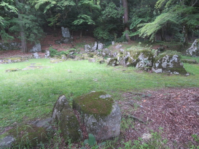 英彦山にある国の名勝に指定されている庭園です、英彦山神宮奉幣殿へ行く石段の参道を歩くと宝篋印塔があり、そこから散策路を入るとあります、室町時代の画僧雪舟が作庭したと伝えられています、山の斜面に滝石組が置かれ、背後に英彦山峰が、いくつもの滝石がありました、ここへ来る人は少ないようで静かでした。