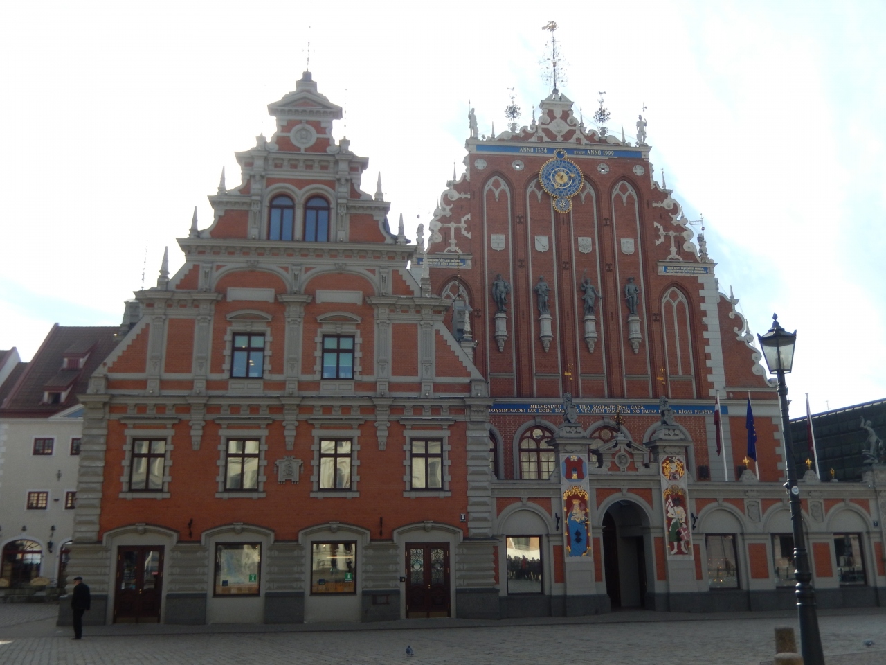 リガの旧市街地、市庁舎広場にある観光スポットでリガの創設800周年を記念して2000年に再建された新しい見所です、彫金細工と彫刻で飾られた個性的な外観が目立ちます、大きな時計、4つの紋章、神々の像が置かれています、夜はライトアップされているようです。