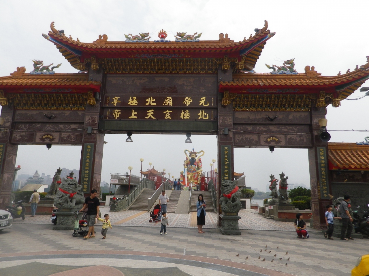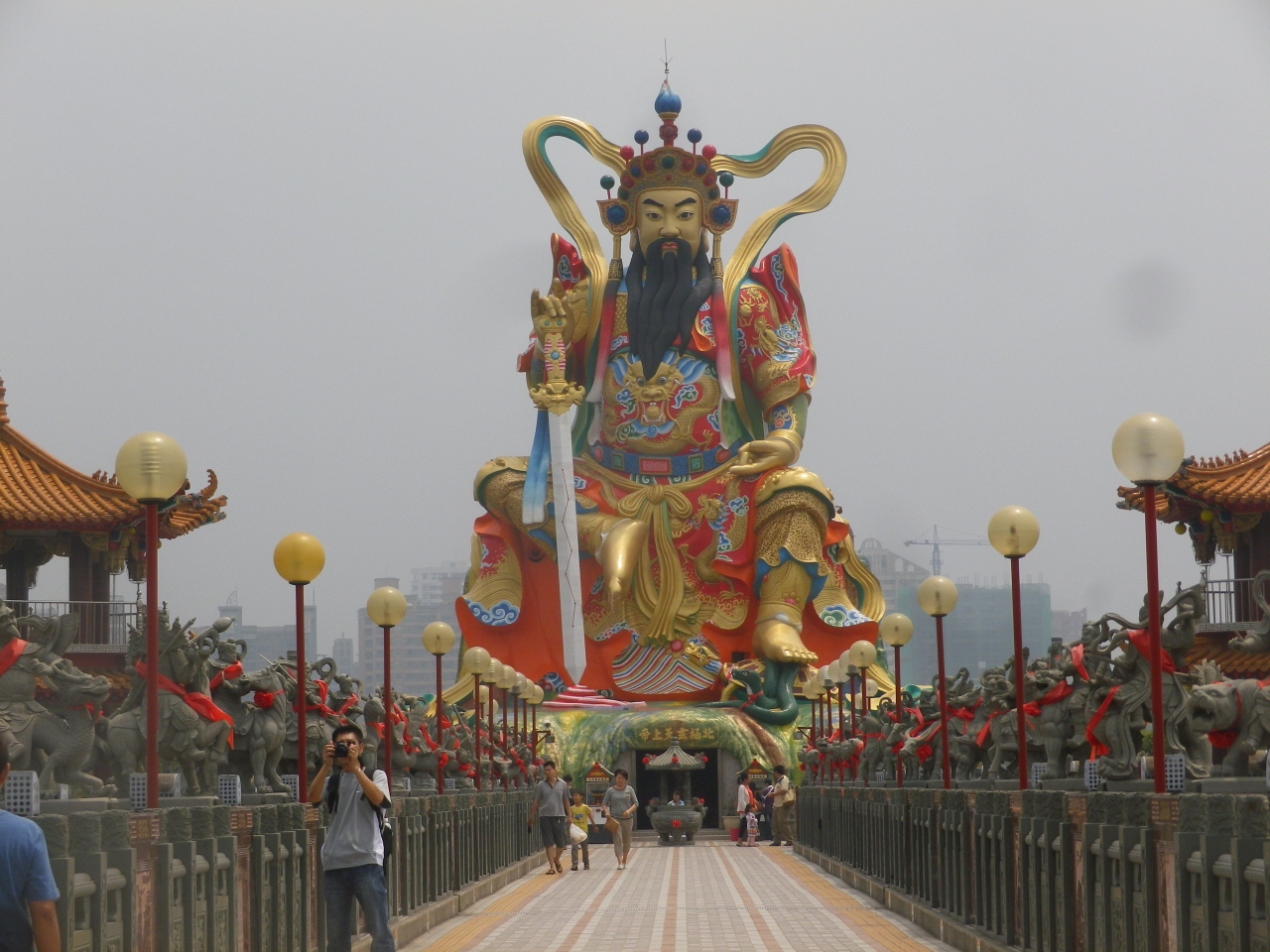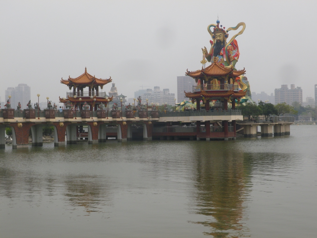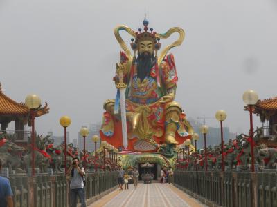 蓮池潭湖畔の西側にそびえ立つ神像です、遠くからも72mもあるので目立ちます、湖畔から専用の橋を歩くと存在感がある神像に到着、手に握られている七星宝は長さ38.5mあり剣のすごさがわかります、入口には蓮池があり綺麗な蓮が見られます、ここも蓮池潭の主要スポットで多くの人が来ています。