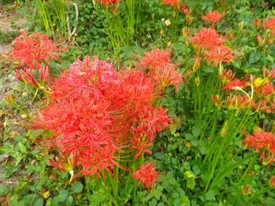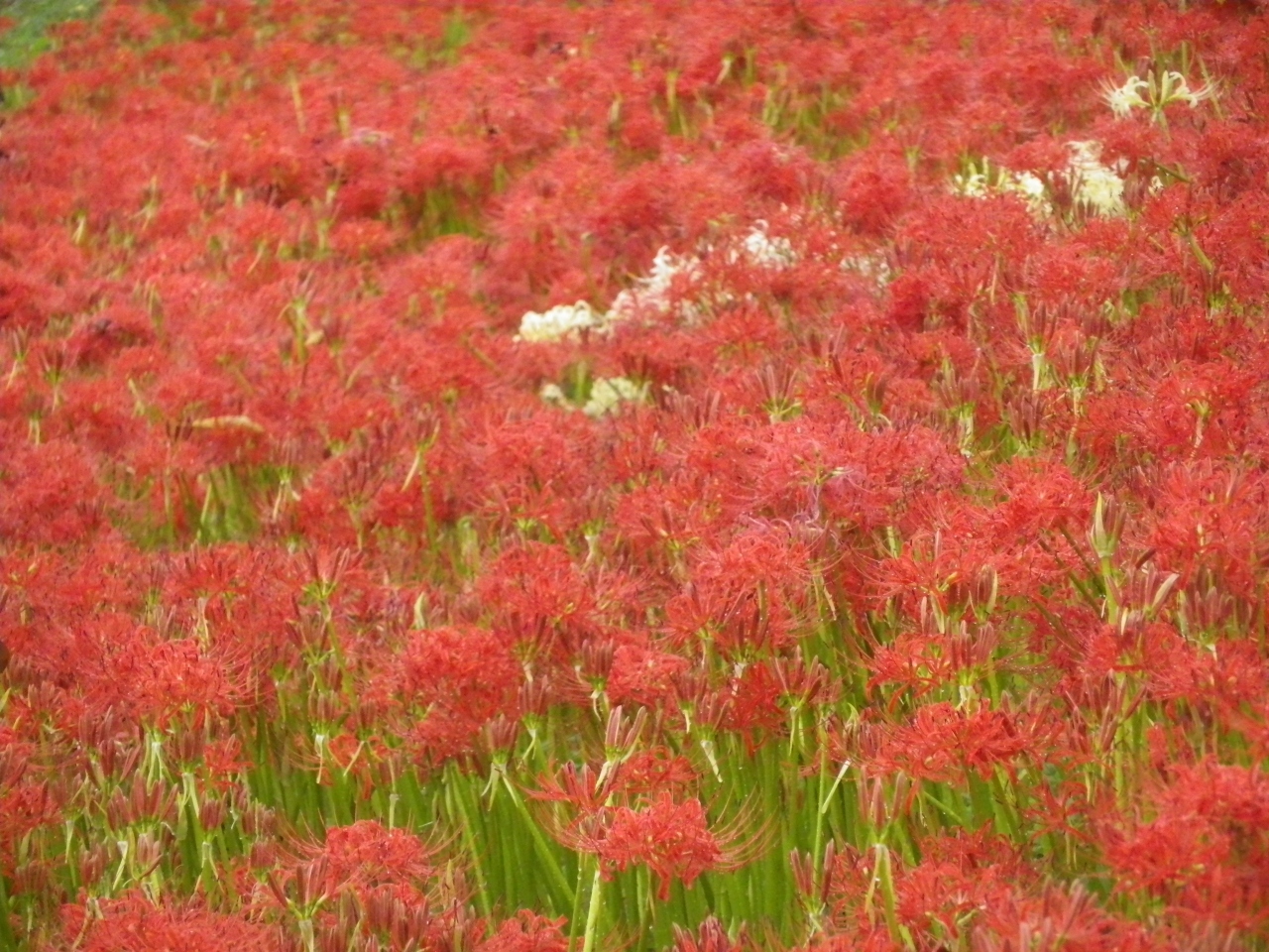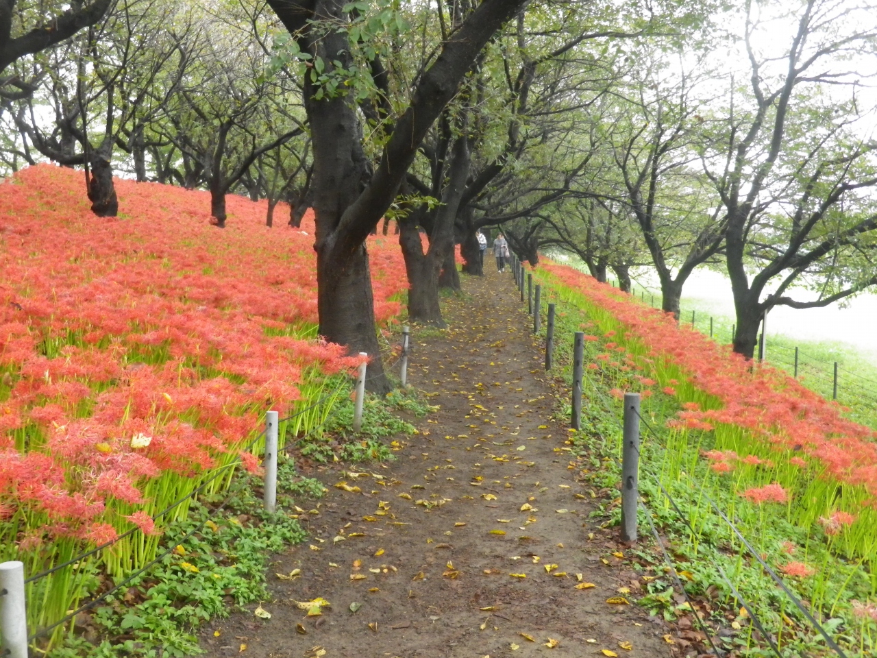 土手の遊歩道沿いを歩くと一面に咲いた赤の曼珠沙崋が綺麗でした、多くの人が歩いていました。