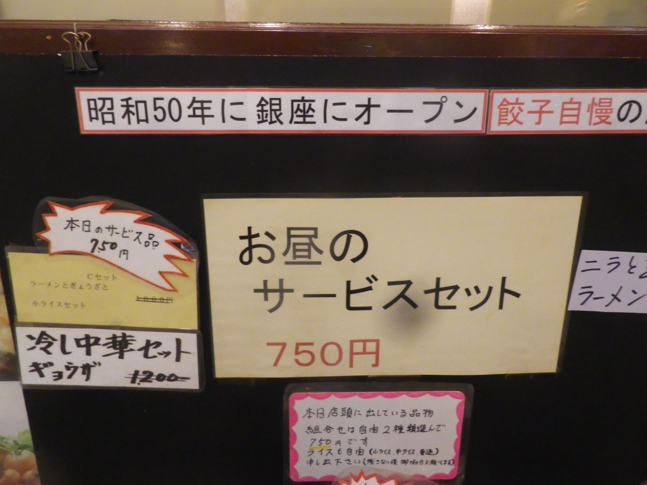 有楽町駅前の銀座インズ2の地下にあるレストラン街にあるお店です、昭和50年に銀座で創業した中華のお店で餃子が自慢ということのようです、お得に食べられるのはお昼のサービスセットです、自慢の餃子とセットで750円はこの地ではお得です、味は美味しかったです、ちょっと時間をずらすと待たずに入れます。