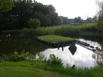 公園内には、桃林の他に蓮がある池や大きな御所池があります、お花は菖蒲や曼珠沙崋の花が楽しめます、。