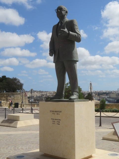 像はヴァレッタ市街の高台、教会や美術館、銀行、アッパーバラッカガーデンがそばにある広場にあります、1916年8月6日生まれのドミニクミントフ(Dominic Mintoff)1916~2012はマルタ共和国の首相・政治家でイギリス自治領からの独立に貢献、マルタ大学とオックスフォード大学で学んでイギリスでは土木技師、マルタでは建築技師として活躍の後1947年より政治家になっています。