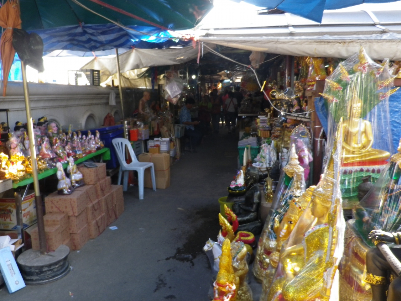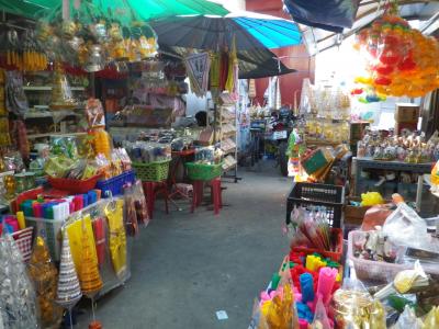 寺院の駐車場に隣接してテントを利用した仮設店舗のようなお店が並んでいます、そこに所狭しとプラと呼ばれる市場があり、仏教用具やお守りなど売られています、覗いてみると日本では見られない変わった仏教用具があり、見るだけでも楽しめます。