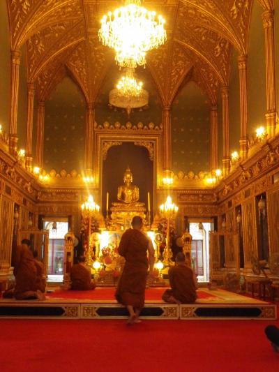 ラーマ5世によって建立された寺院で、外壁は中国製タイルを使用、中にシャンデリアが吊り下げられていて洋風さが感じられる寺院。- 旅行時期