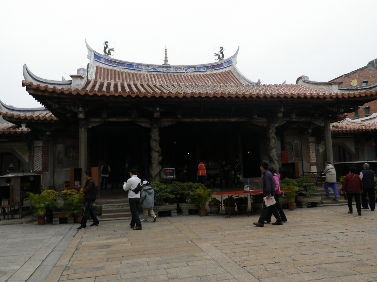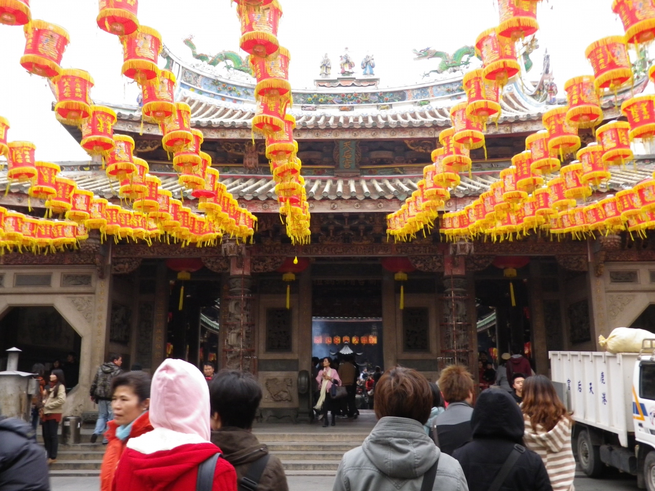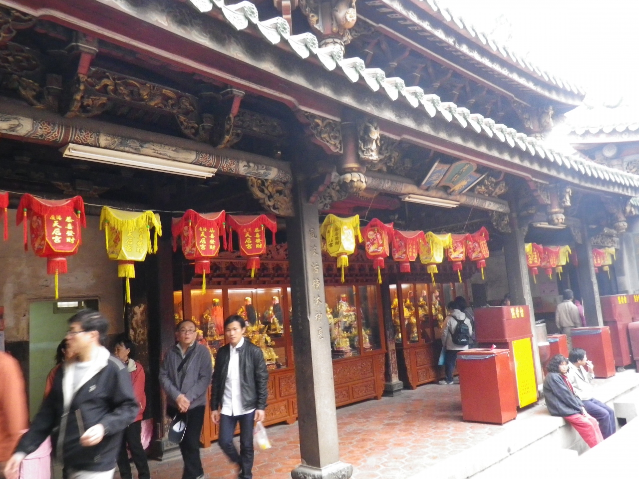 寺院内の彫刻や立派な門が見られる、普段から多くの信者で賑わっていて、寺院前には多くのお菓子販売のお店やカキのかき揚げなど食べさせるお店が並んでいる。- 旅行時期