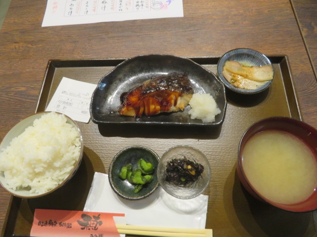有楽町駅前電気ビルの地下の食堂街にあります、東京メトロ日比谷駅とは直結です、ランチがリーズナブルなので入りました、店に入るとすぐ、テーブル席とカウンター席がありました、14時頃で空いていたのでテーブル席に座りました、本日の焼き魚からムツの照り焼き(880円)を食べました、味噌汁は日替わりで行った時は西京味噌のきのこ汁でした、ごはんと味噌汁はお替りができます、夜は居酒屋になります。