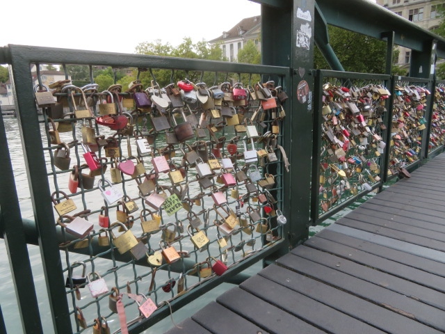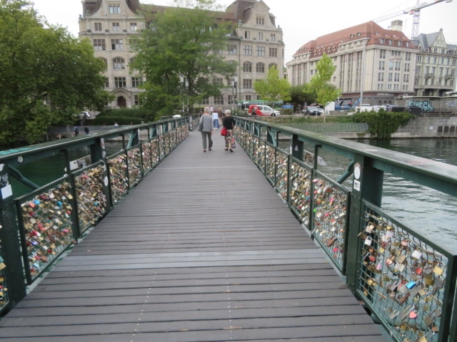 チューリッヒ中央駅から宿泊で利用したアルクサンダーホテルに行く時渡りました、チューリッヒ市街を流れるリトマ川に架かる歩行者専用の橋です、愛の橋と言われているようで欄干に南京錠がたくさんありました、橋上からの眺めもいいです、車が通らないので安心して歩けました、チューリッヒ市街を眺め楽しみました、駅から大聖堂に行く時渡るといいです。