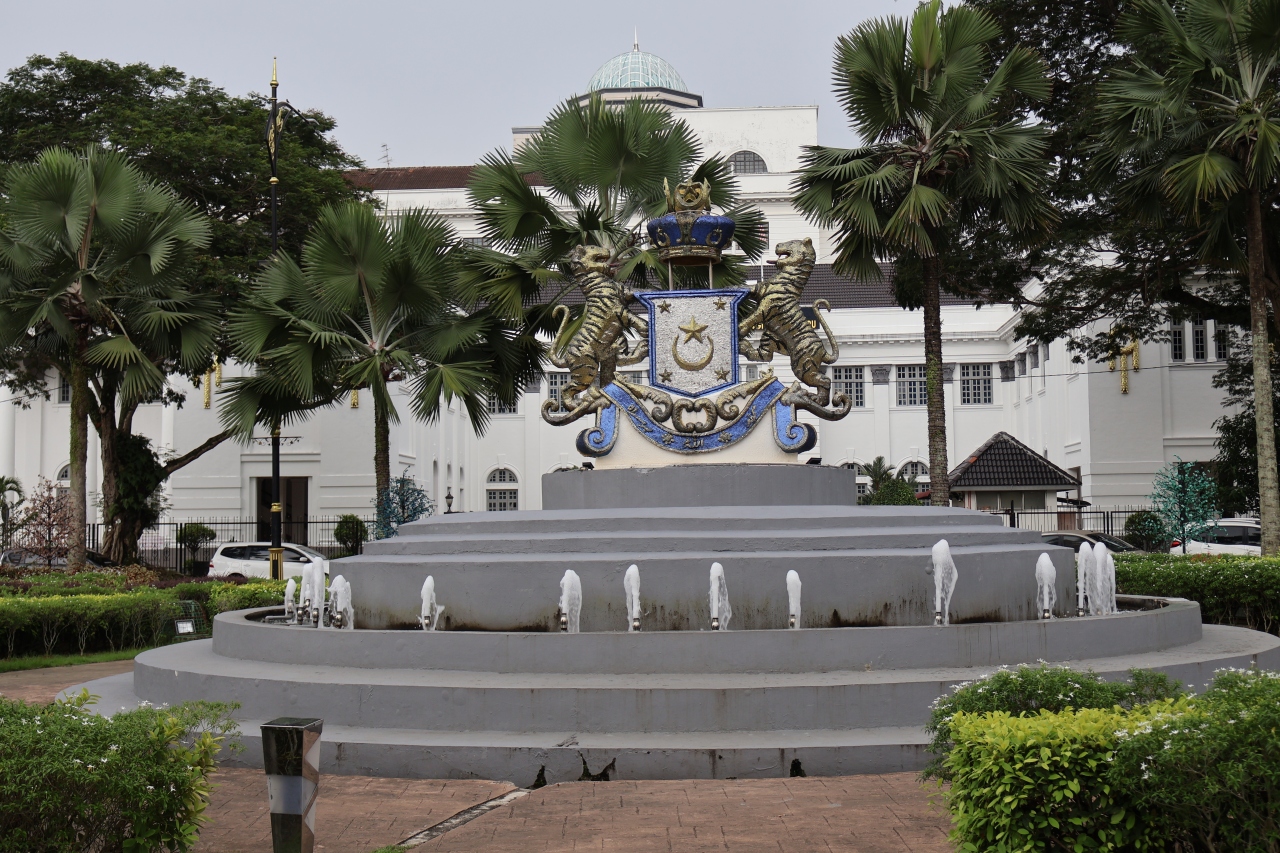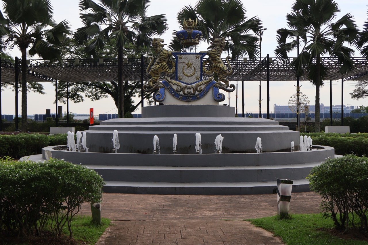 ジョホールバル市街の南部、ジョホール海峡に近い場所にあります、モニュメントは海峡沿いの大通り・ジャランンイブイブラヒムと郵便局・裁判所前の通りの間にある公園内の裁判所前にあります、周辺の散策をしている途中に見ることが出来ました、噴水があるモニュメントの周りにはお花も咲いていました。